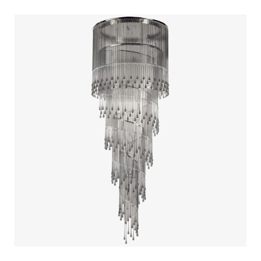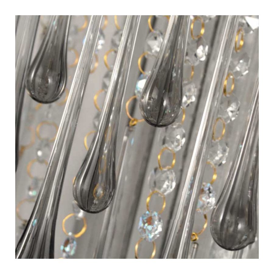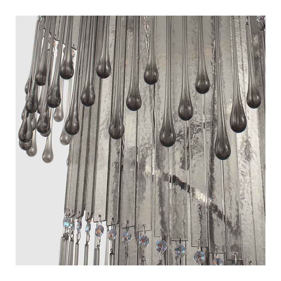 The whole structure is composed of a cascade of tiny glass elements of different shapes, that reminds the fringes typical of the 20’s fashion: thin glass foils, drop-shaped elements and Swarovski glass elements.