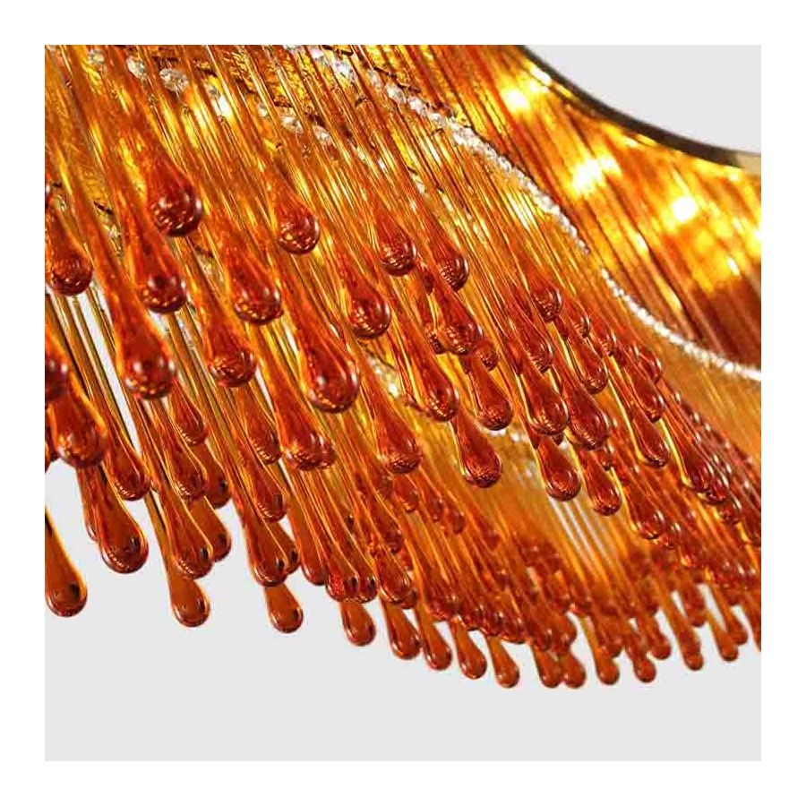 The whole structure of this chandelier is composed of a cascade of tiny glass elements of different shapes, that reminds the fringes typical of the 20’s fashion: thin glass foils, drop-shaped elements and Swarovski glass elements.