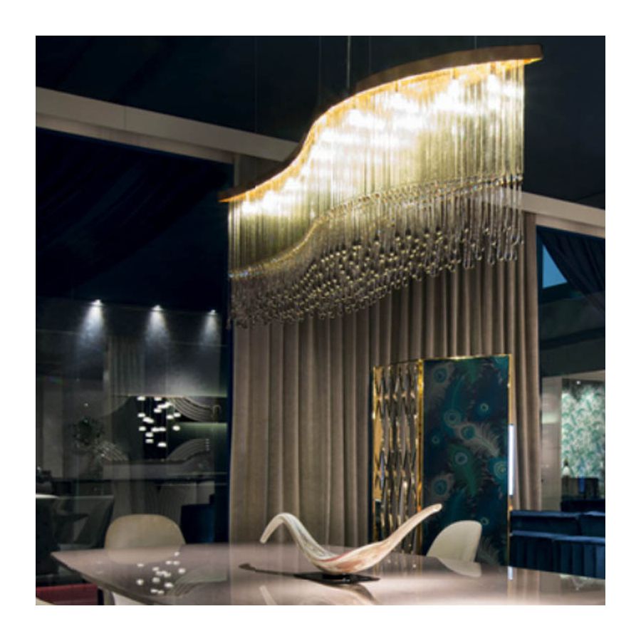Inside this structure are placed the light bulbs; the light therefore comes out passing through the glass elements, thus creating a multitude of glares in the surrounding space. Dancer is an extremely versatile chandelier, a decorative solution that can easily suit architects and interior designers’ needs.