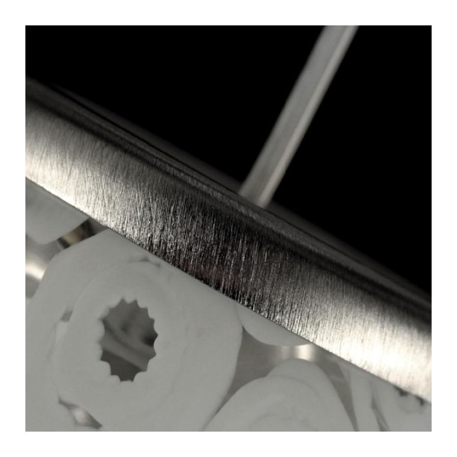 This lamp has a modular structure: the module is a blown glass drop-shaped element, decorated with concentric white “murrine”. Each drop-shaped element is completed with a nickel finishing, that give to this lamp a modern taste; also the ceiling structure is in nickel.
