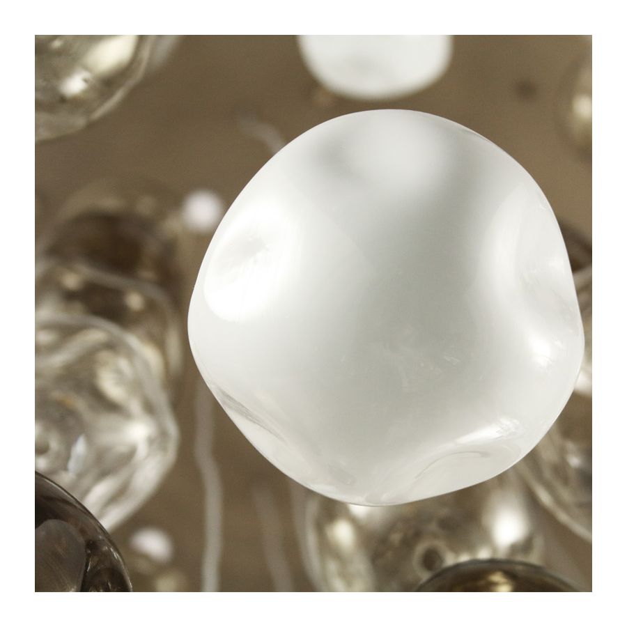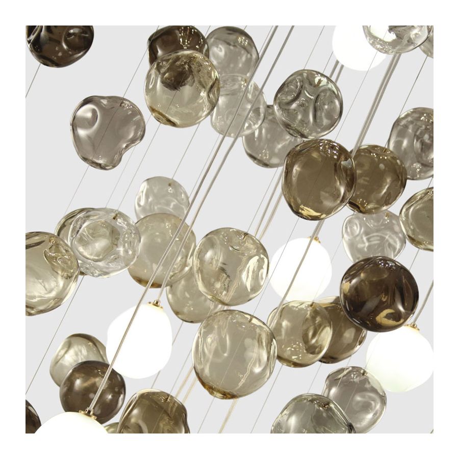 This lighting creation consists of a circular ceiling structure characterised by a burnished brass finish to which are hanged, with thin cables, spheres in hand-blown glass. These elements are mouth-blown by Murano glass artisans and have a slightly irregular surface, which allows light to reflect in different directions, creating an elegant game of reflections and glows that is accentuated when lights are on.