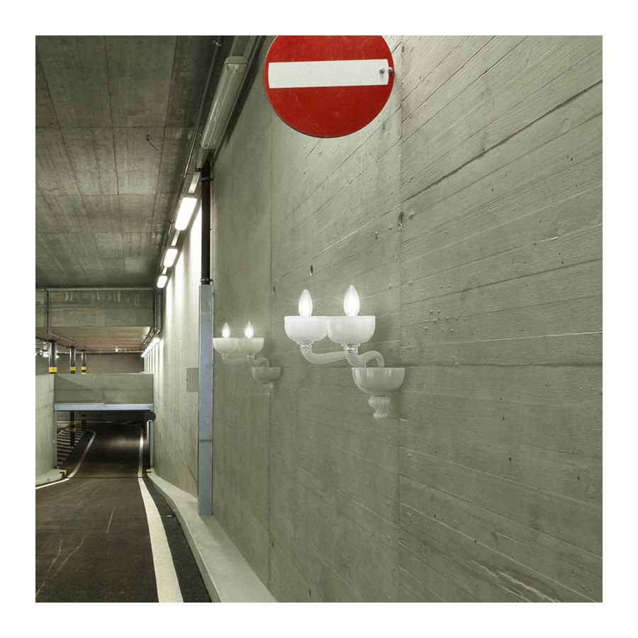 All the elements that form this wall lamp are worked using the "rigadin" technique, that allows to obtain a dynamic surface and many reflections on the glass. The clear arms extend through the external space; the unusual and refined final element encloses the whole structure.