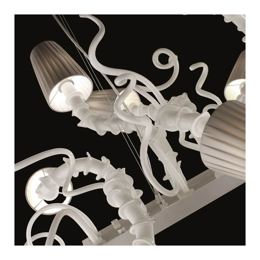 All the elements are handcrafted by our masters glass-worker, they are unique pieces that composed inimitable creations. The twisted glass elements and the Rezzonico arms are fixed on a clean white structure that contrasts with the glass decorations.