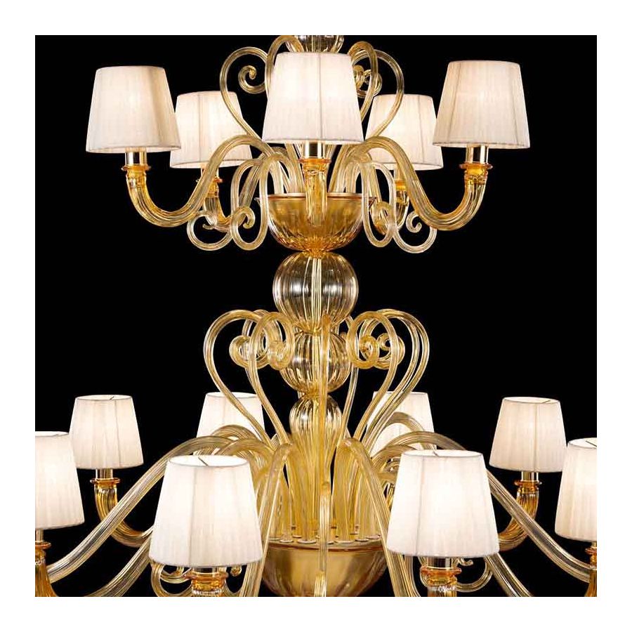 The venetian chandelier Gatsby is the perfect combination of elegant and modern elements. The surface with straight ribs, the spherical elements in the central arm, the lampshades in plissè fabric and the pastoral elements – all this contributes in creating a dynamic composition.