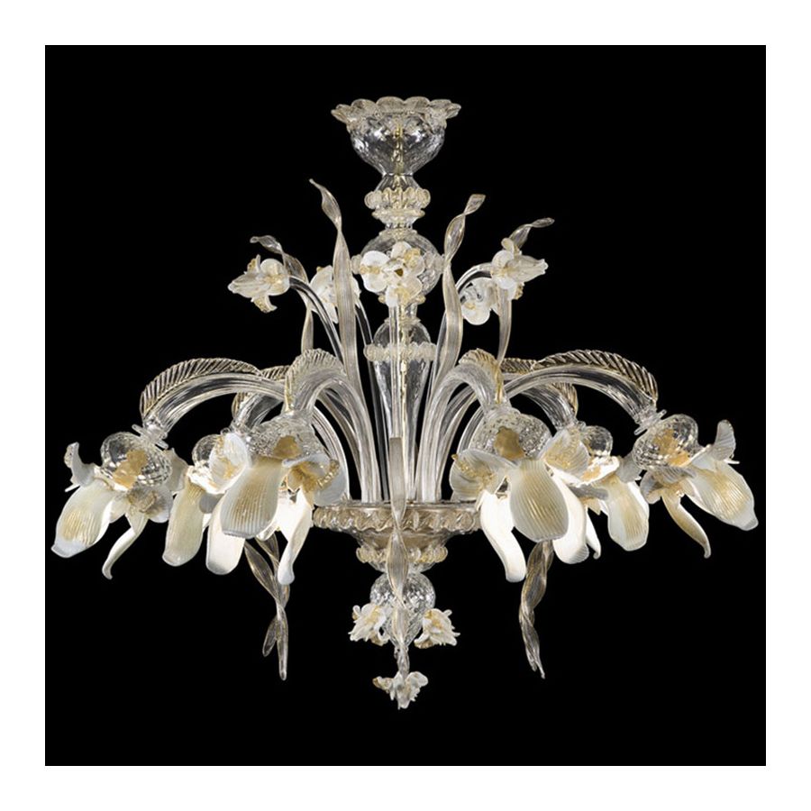 It is a collection that exalts the polychrome Murano glass decorations, that covers the entire architecture. The collection is characterized by polychrome glass iris of various sizes, flawlessly handcrafted by our masters glass-worker. The iris characterized also some elements of the structure, such as the cups.