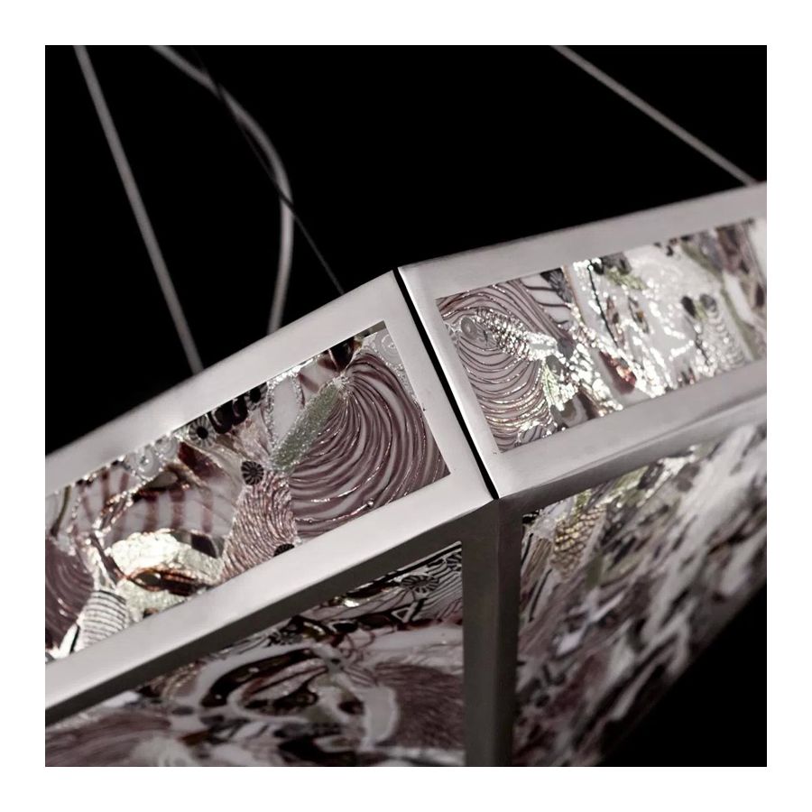 The metal structure, like the glass plates, has been manufactured with attention to details, as it is typical of the Made in Italy tradition: the quality of the finishings goes hand in hand with the quality of the glass decorations. Mystique is a simple structure that can be widely customised, both for the metal structure and for the glass plates. A special version of this modern style glass lamp, in artistic glass, has also been designed. It is a unique piece of art in which the glass plates become a bidimensional representation of the Murano glass decorative techniques, as if it was a bidimensional vase.