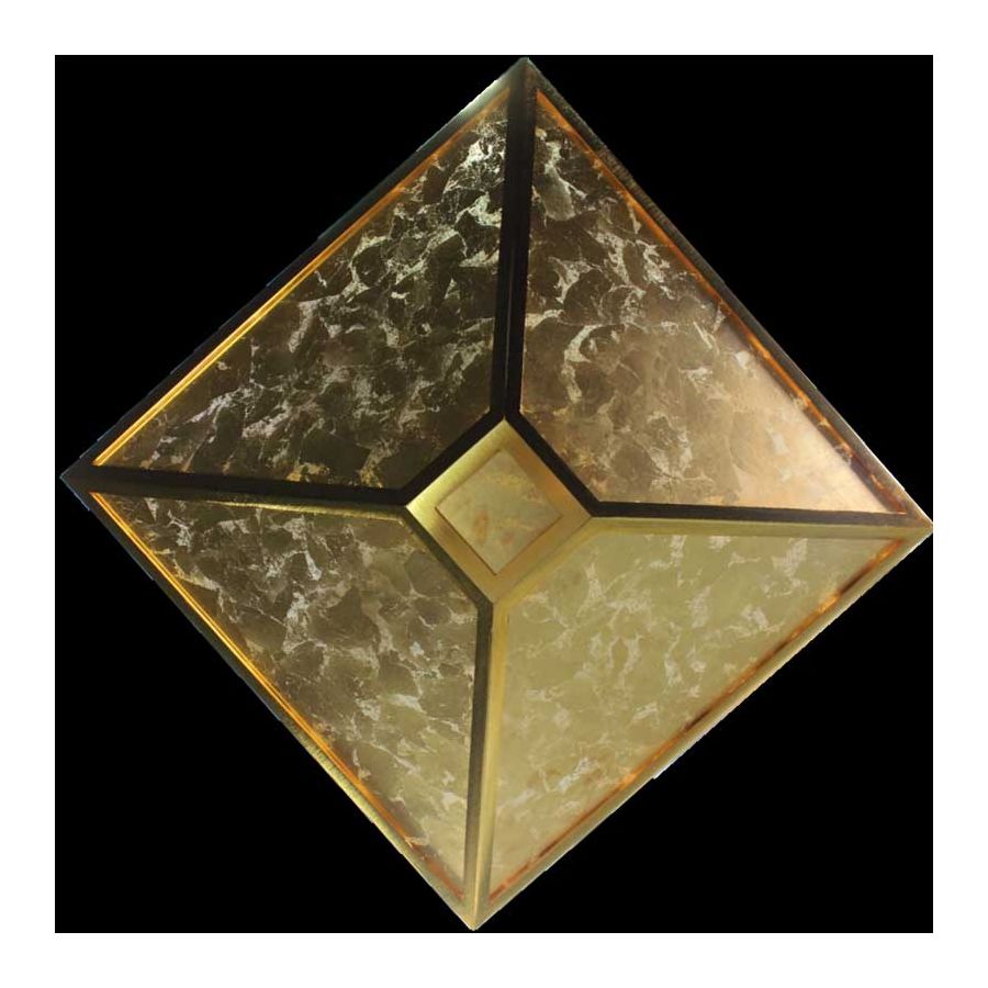 The suspension lighting Mystique has a neat geometric structure. It has been designed with the purpose of creating a lighting work with neat and simple volumes. This suspension lamp wants to celebrate the decorative power of the handcrafted glass plates. The techniques used to decorate the plates are that used to decorate the Murano glass objects, but in this case they have been adapted to a bidimensional surface. The metal structure is proposed in the catalogue with a brushed finishing, but other finishings are available.