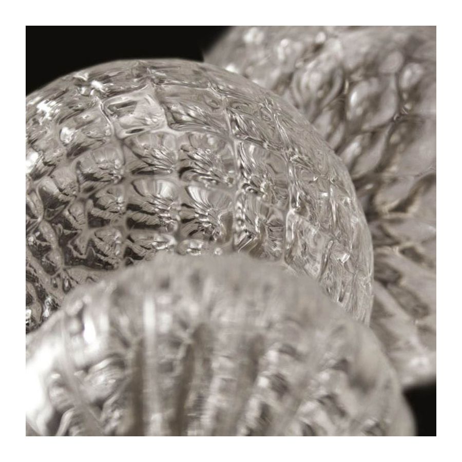 The source of light is positioned above the spheres, so that the light can pass through them and create beautiful glares on the glass surface. This is an elegant lighting work, made with high quality materials and refined techniques, but at the same time it is an ironic composition.