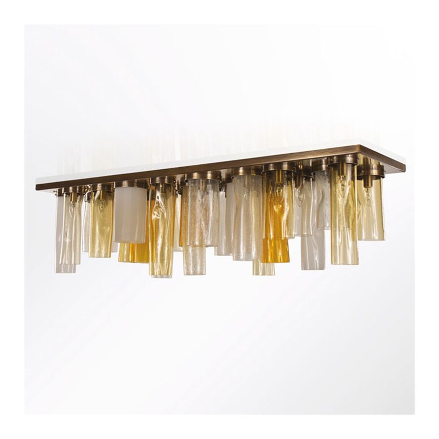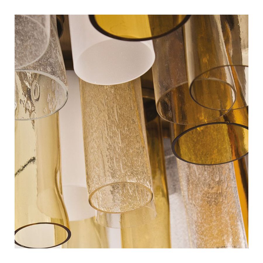 The quality of this lighting work lies on the techniques used and on the attention to details in the assembly of the various parts. The handcrafted glass decorations are extremely valuable. Each glass element is handmade, some dynamism is given by the dents on the tubular elements.