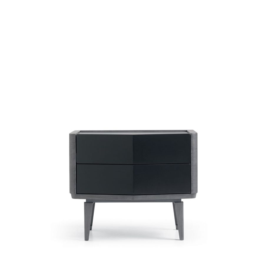 Two-drawer bedside table with simple, strong lines that characterise the Denver collection. Graceful but effective colour contrasts enhance the dynamism of the shapes and the play of proportions. Available with lacquered or veneered doors in Canaletto walnut or inlaid ash. Top in lacquered wood, marble or mirror.