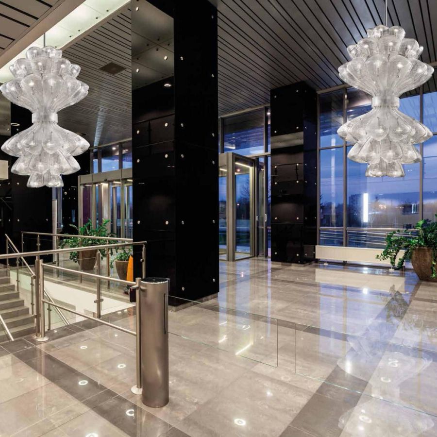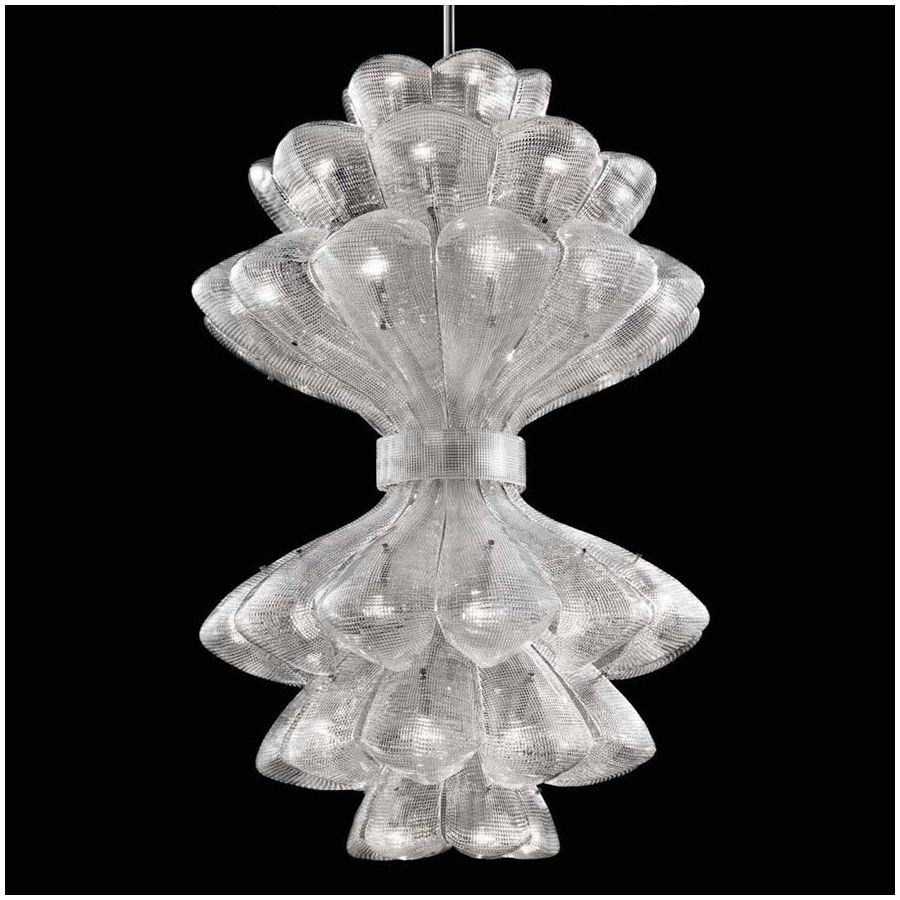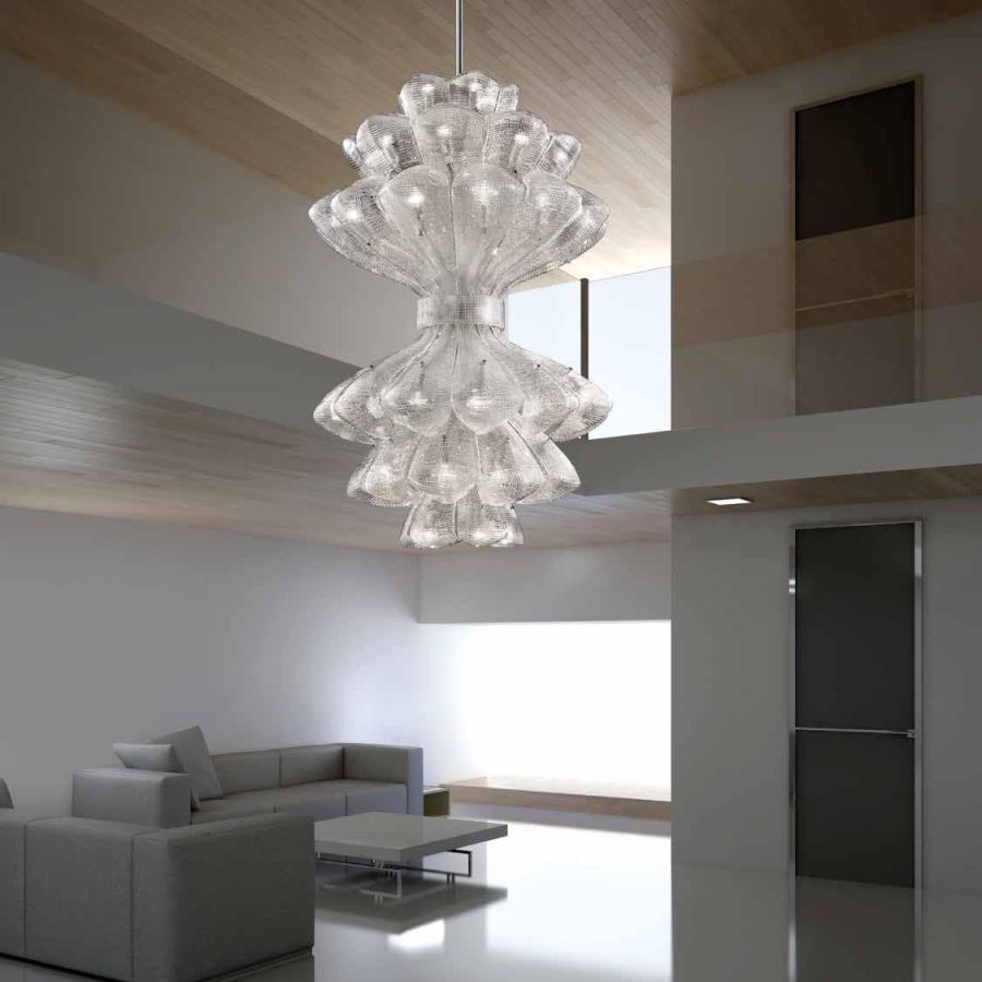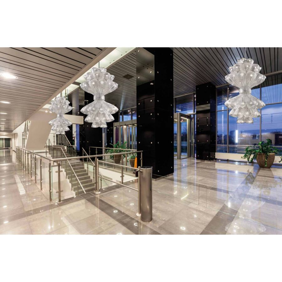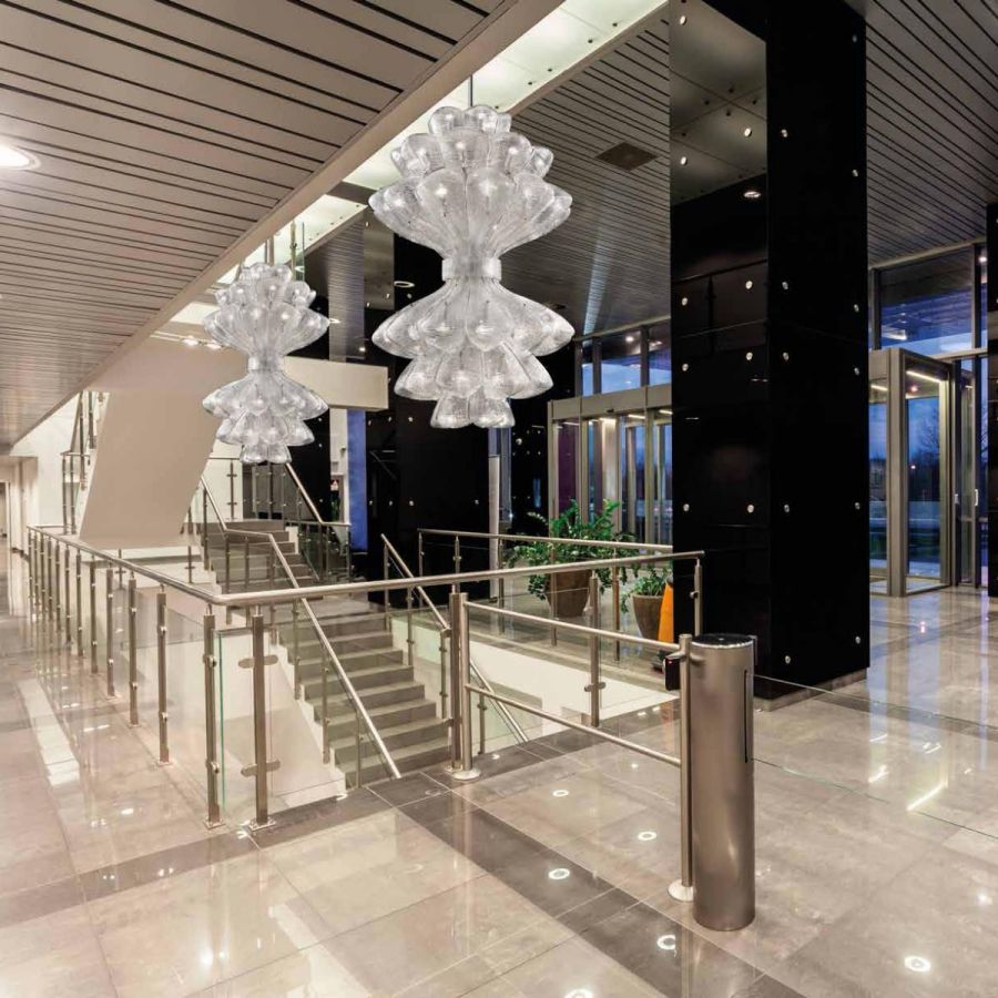 Precious installations in murano glass, individually forged hand made by glass masters. The harmonious modern sculpture forms, the refined work, the beautiful effects of light render the large chandelier Naga 2 an ideal solution for any environment.