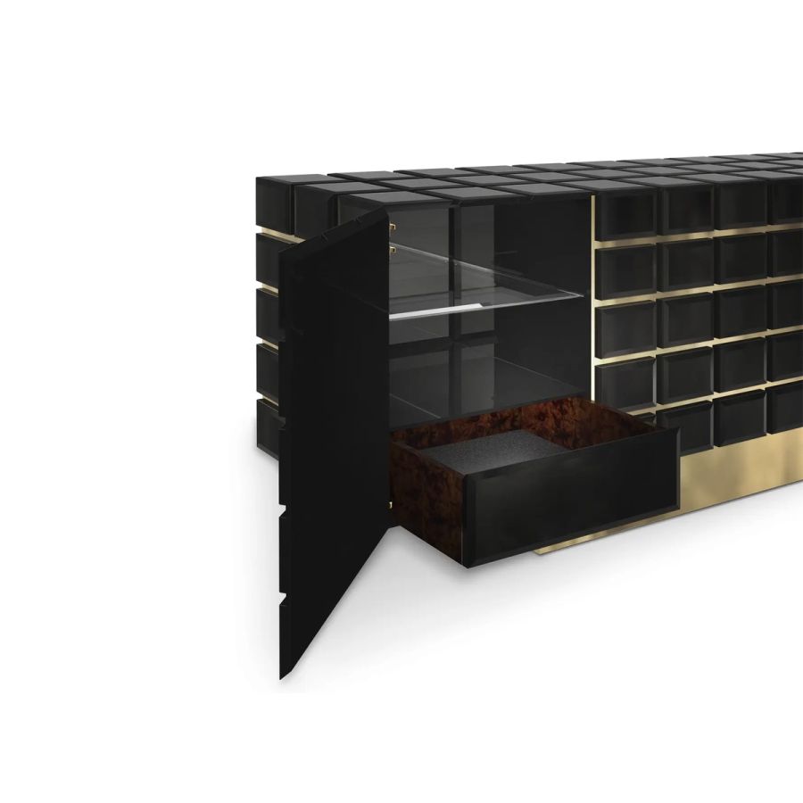 Drawing inspiration from the geometrical feats of the Nubian pyramids, the Nubian Sideboard is a versatile piece that is perfect for living rooms, dining rooms, or elegant hotels. Crafted with high-quality wood and polished brass accents, it exudes a sense of luxury and serves as a striking centerpiece in any setting.