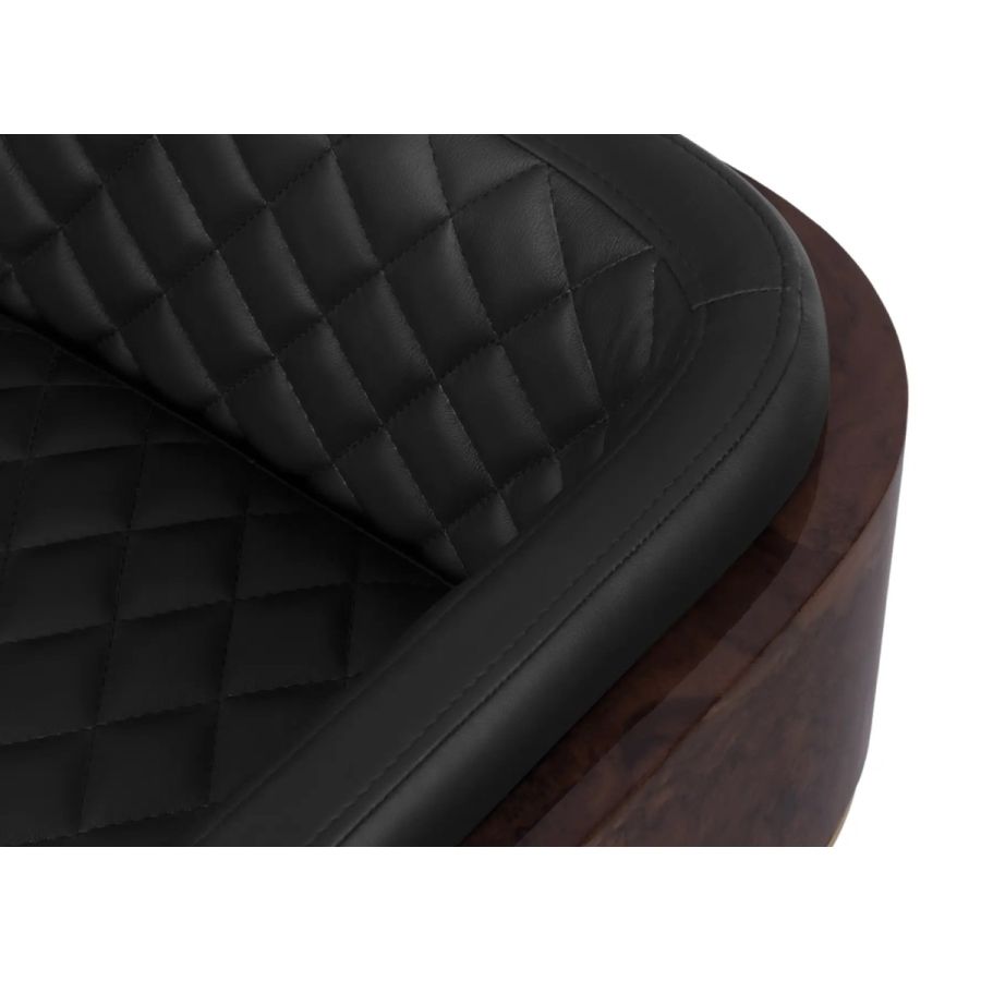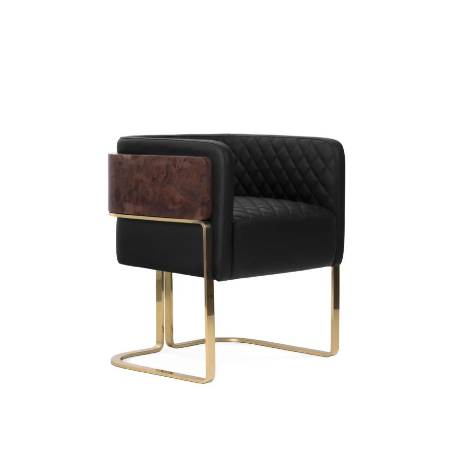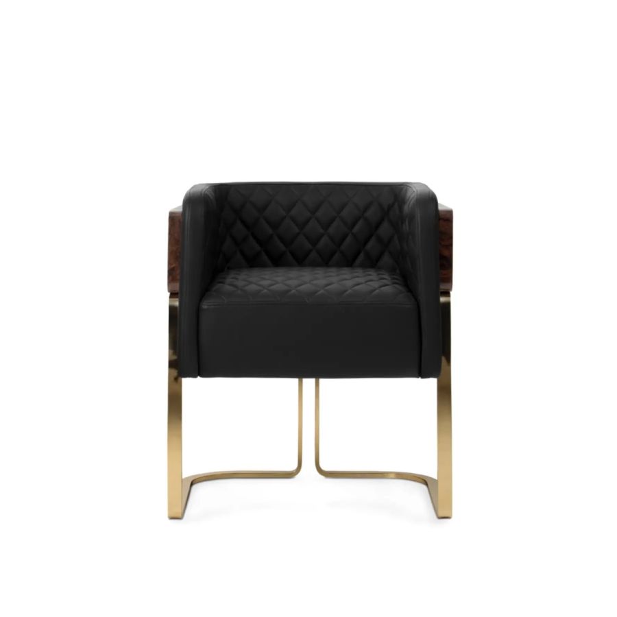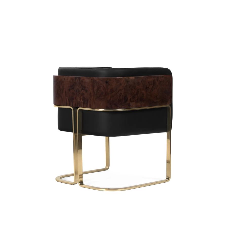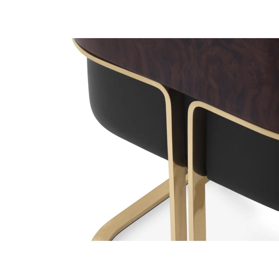 Featuring a uniquely shaped backrest, the Nura Dining Chair is the ultimate expression of cozy luxury. Shaped like a U, Nura is made of leather, brass, and wood and provides an embracing comfort only found in upholstery solutions with the same shape. Ideal for cozy yet glamorous dining rooms and restaurants.