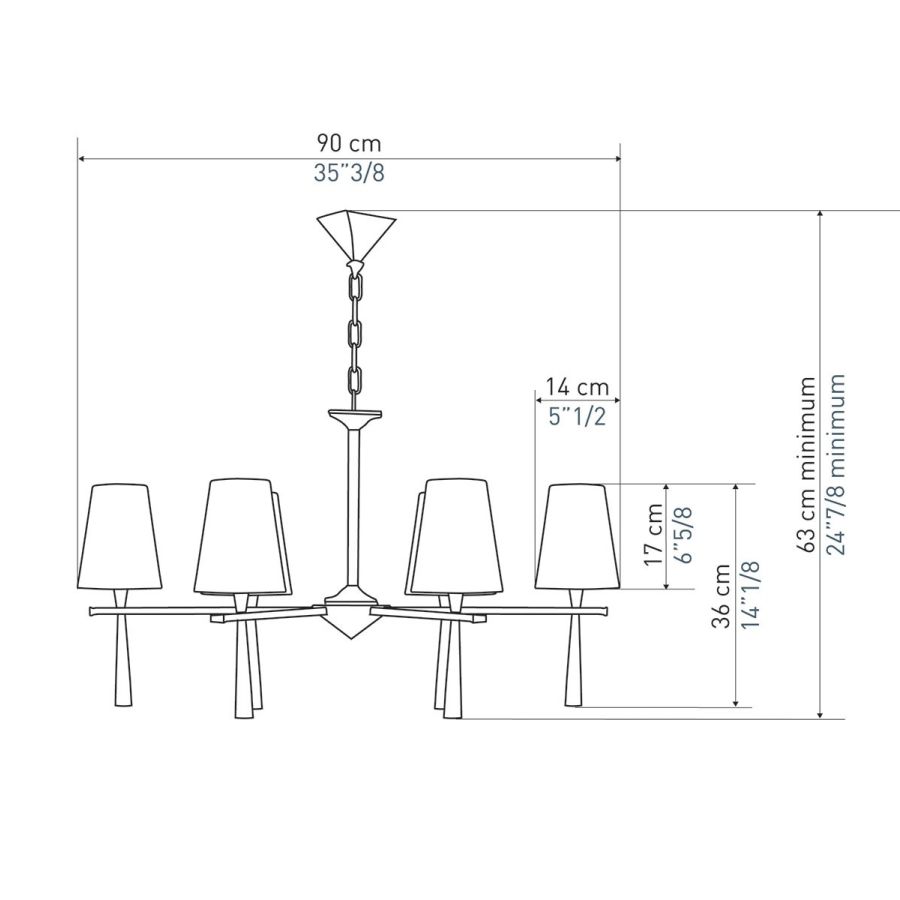 Height: 63 cm minimum, Width: 90 cm, Maximum: 6 x 40 w