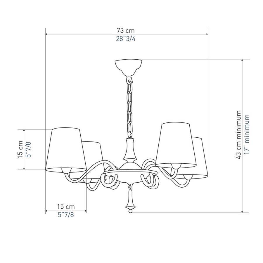 Width: 43 cm, Maximum: 4 x 40 w, Les Abat-jours peuvent être fabriqués dans 18 coloris au choix, The colour for the shades can be chosen out to 18 different hues