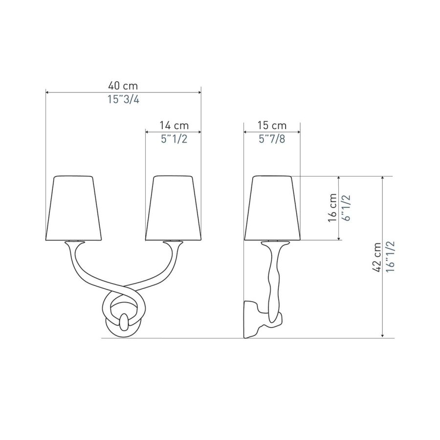 Width: 40 cm, Projection: 15 cm, Maximum: 2 x 40 w, Les Abat-jours peuvent être fabriqués dans 18 coloris au choix, The colour for the shades can be chosen out to 18 different hues