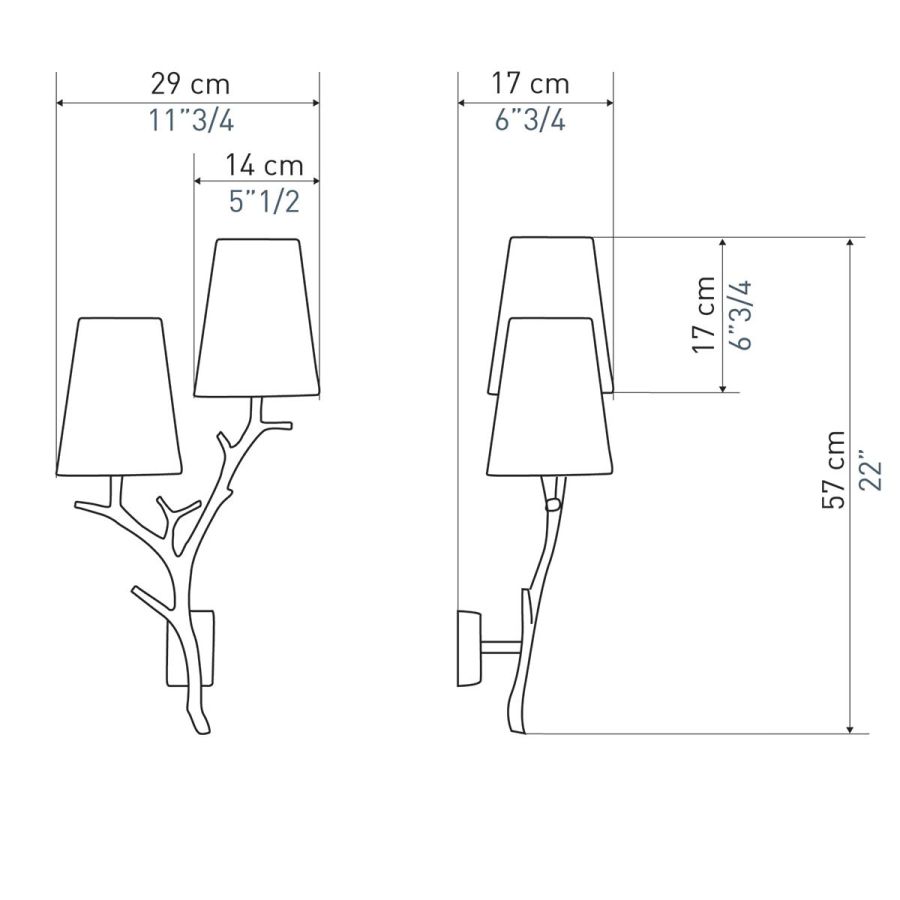 Width: 29 cm, Projection: 17 cm, Maximum: 2 x 40 w, Les Abat-jours peuvent être fabriqués dans 18 coloris au choix, The colour for the shades can be chosen out to 18 different hues