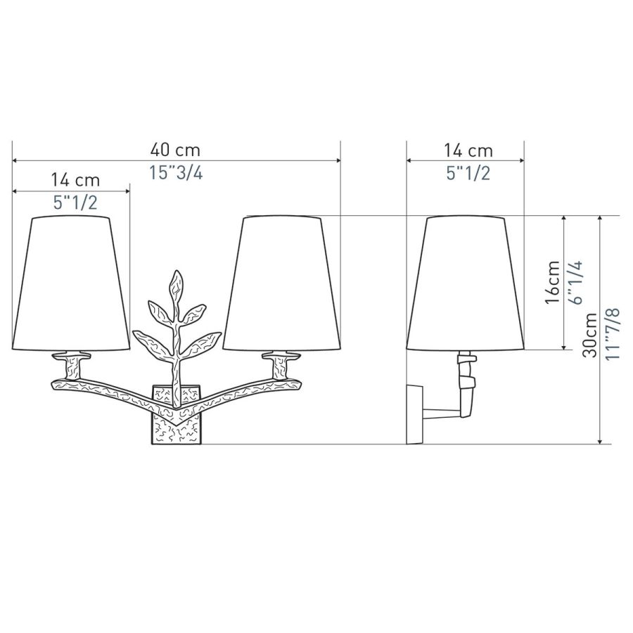Width: 40 cm, Projection: 14 cm, Maximum: 2 x 40 w, Les Abat-jours peuvent être fabriqués dans 18 coloris au choix, The colour for the shades can be chosen out to 18 different hues