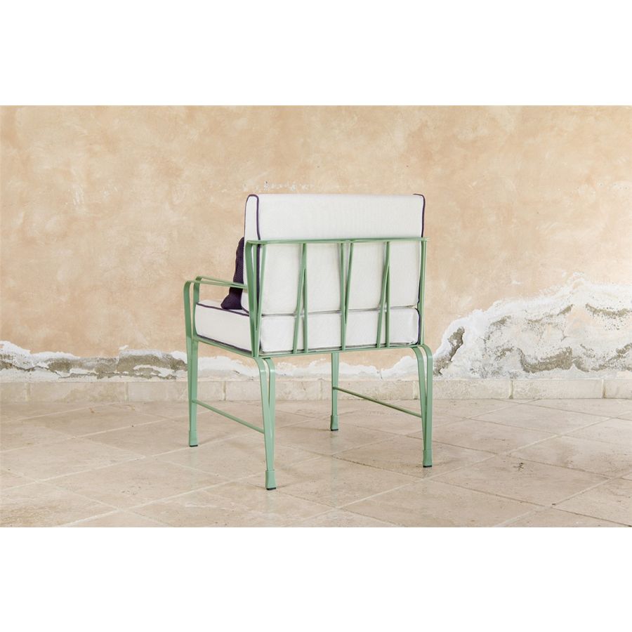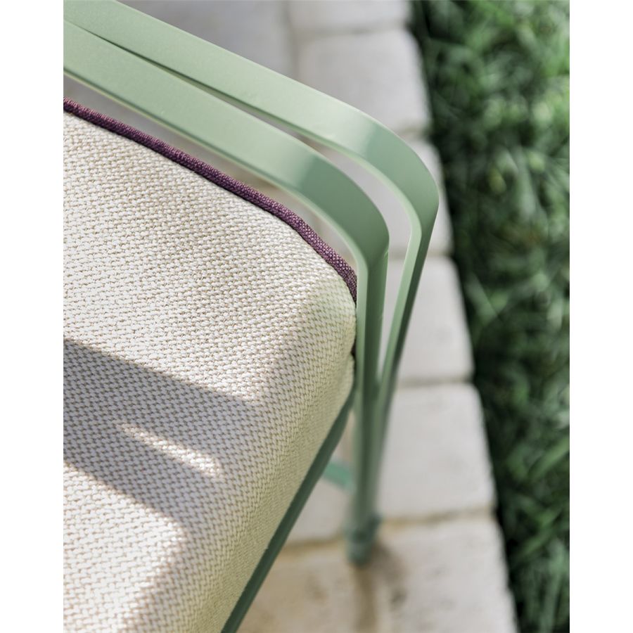 AISI 304 stainless steel forged chair with arms made with the tuscany craftsmanship savoir fair. Simple lines for this timeless collection of outdoor furniture to dress endless spaces, the Marina series is also available with indoor finishing, powder-coated for otudoor, with cushions in Sunbrella Nattè Col.Nature included.