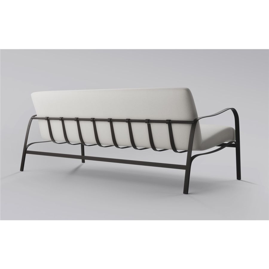 Sofa in forged AISI 304 stainless steel plate, powder-coated, fixed cushions in Sunbrella Nattè Nature (NAT 10014 140), protective covers included. Powder-coated.
