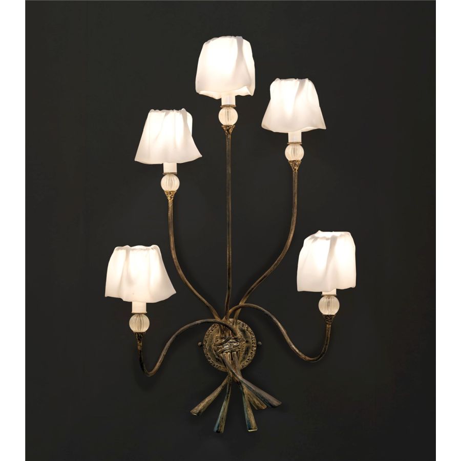 Vägglampetter i järn dekorerade med väggfäste och glasdelar. Mjuka lampskärmar i siden. LED-belysning i den nedre delen. Ljus: 5L. x 40W E14