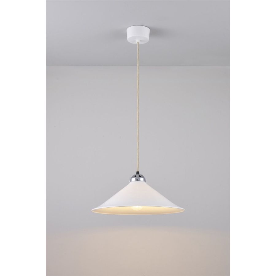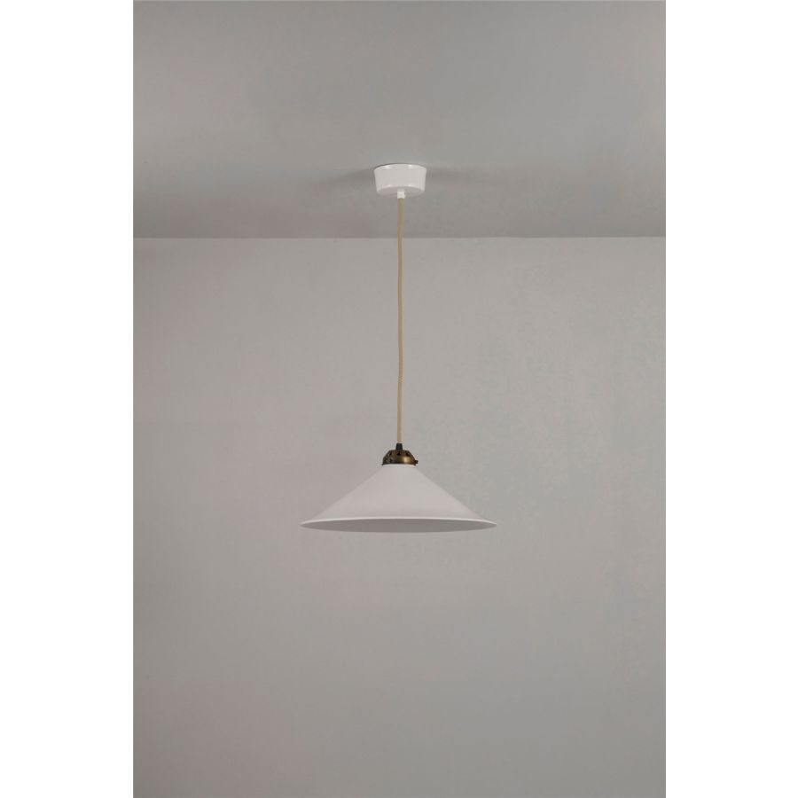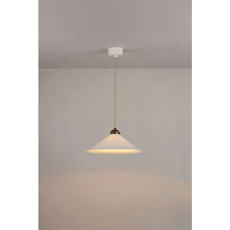 Traditionally inspired with a contemporary twist, the Cobb Pendant draws inspiration from a Dutch cobblers light. Modernized with a bone china shade and our smart braided cotton cable, this pendant is an ideal choice for lighting dining tables and kitchens, available with polished chrome, satin brass or antique brass metal work.
