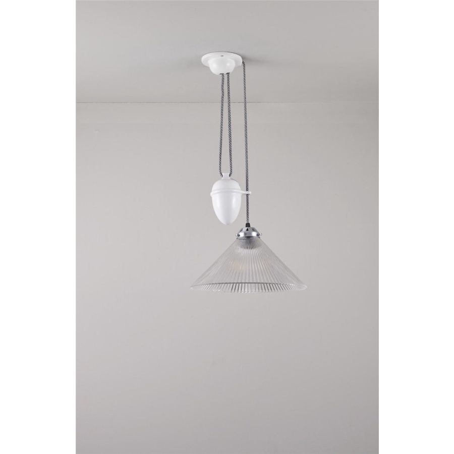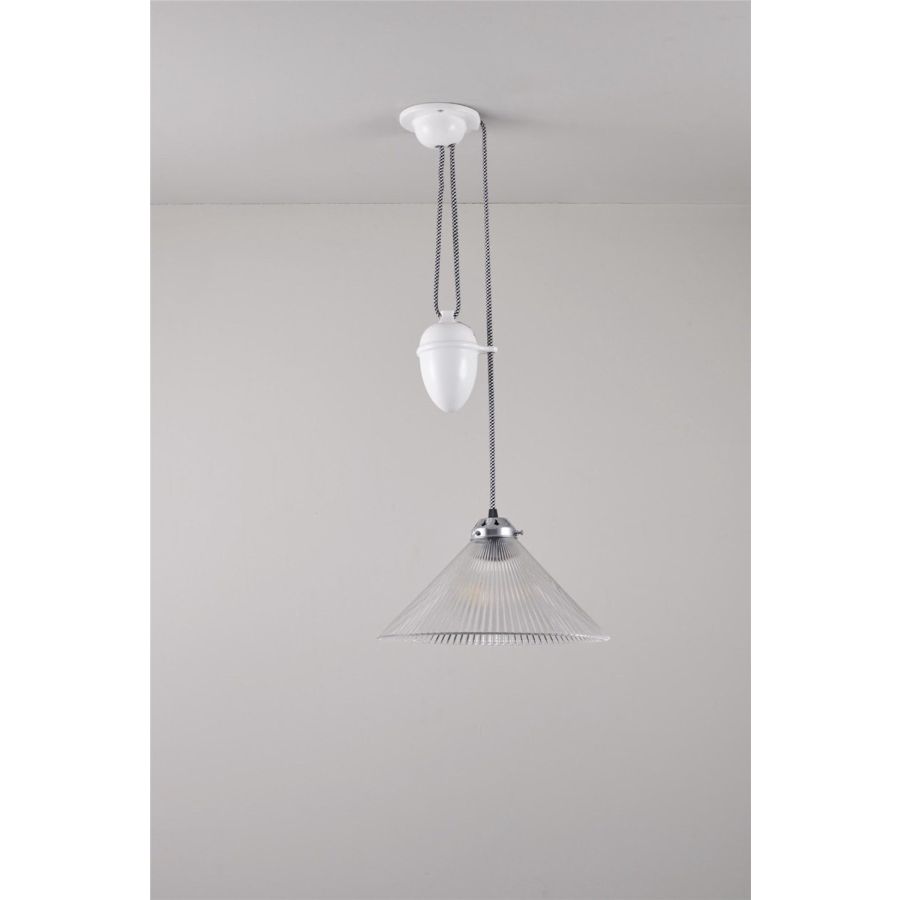 Traditionally inspired with a modern twist, the Conical Prismatic Rise and Fall Pendant allows you to adjust the height and vary lighting effects, making it the perfect choice for dining tables and kitchens; simply lower the light for intimate dinners or raise for a broader pool of general light. The prismatic glass shade allows for an even dispersion of light, and is finished with our signature cotton braided cable.