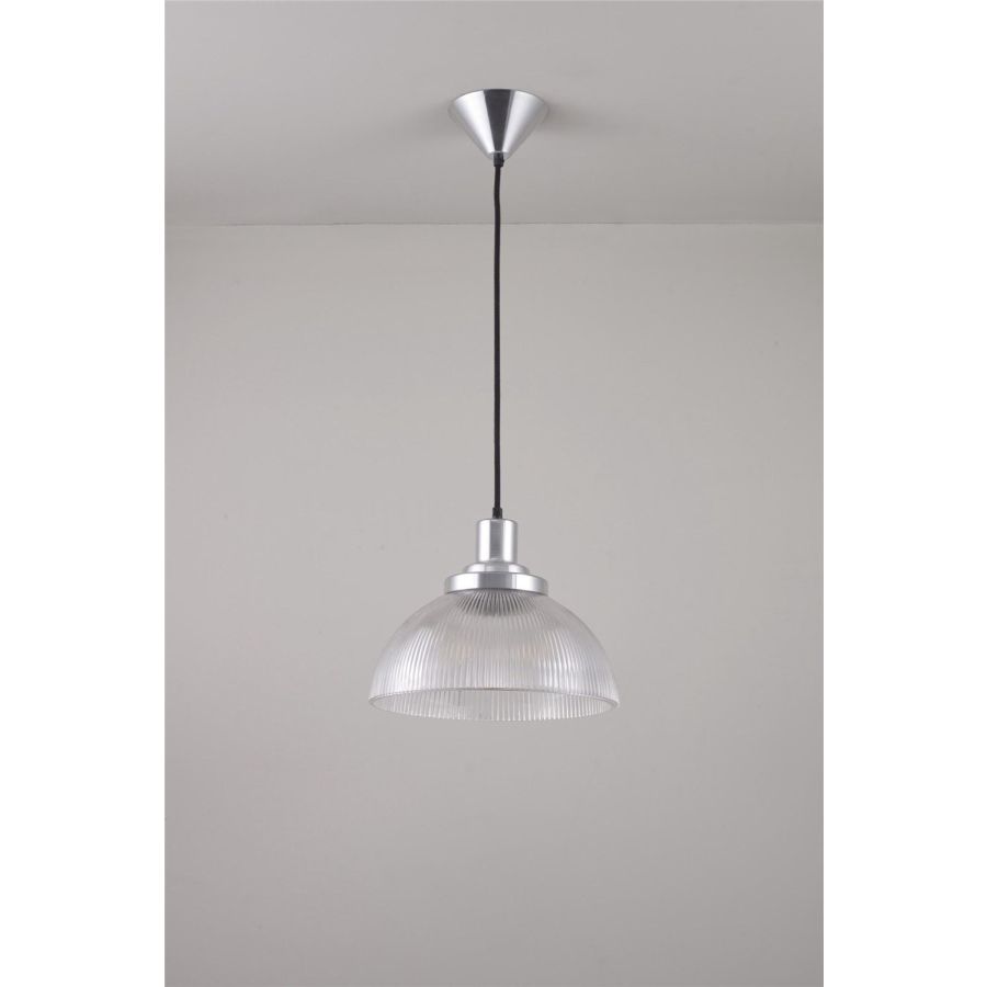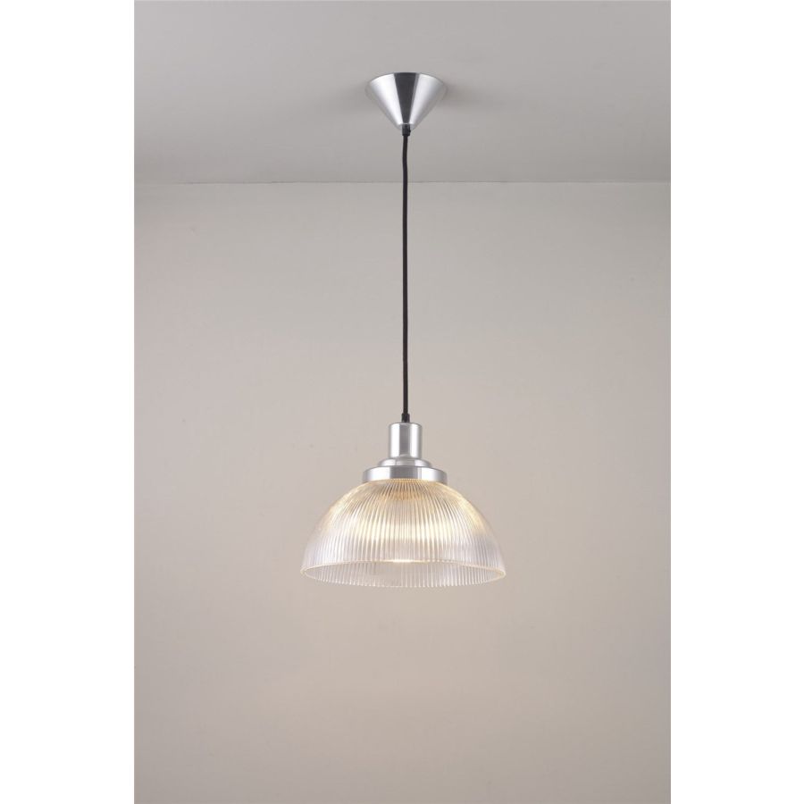 The Cosmo Prismatic Pendant has a shortened semi sphere glass shade that gently diffuses a soft ambient glow. Also available as a table light.