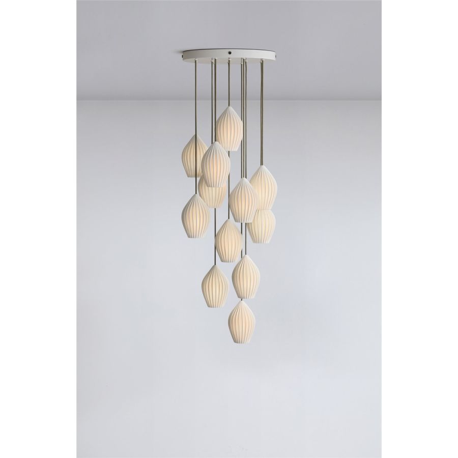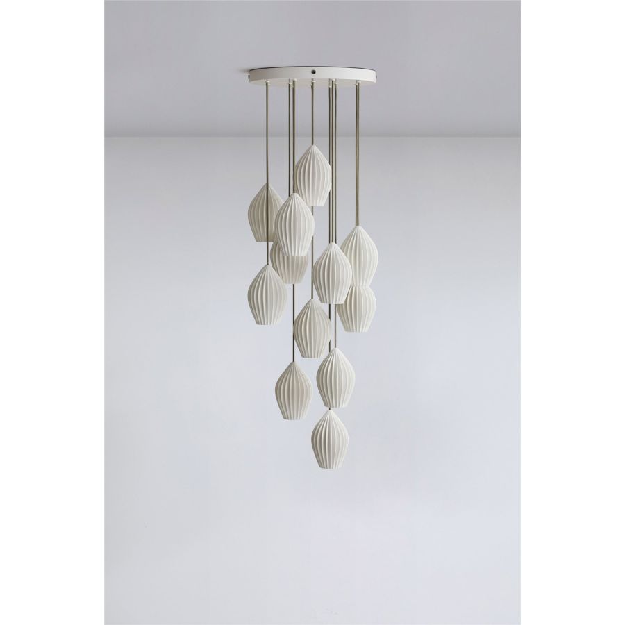 The Fin Grouping brings spectacular impact to one of our most beloved designs. Featuring 12 or 18 individual pendants, this dramatic composition transforms stairways, hallways, receptions and larger living areas. The intricate handmade bone china shades emit a generous downward light while glowing beautifully themselves to enrich the atmosphere of the room.
