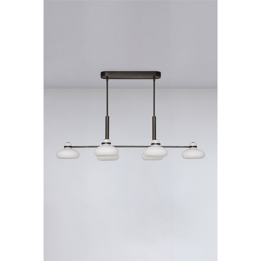 The Magnus pendant captures the fluidity and natural movement of molten glass. Sculptural shades in soft opal white are held in a sleek metal frame in rich blackened bronze. The fixture provides plenty of direct lighting to surfaces below, while the shades emit a warm glow, enriching the atmosphere of any room.