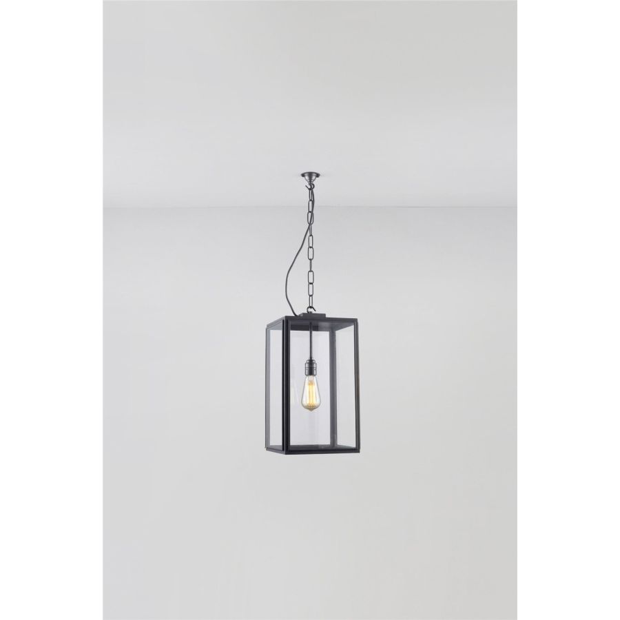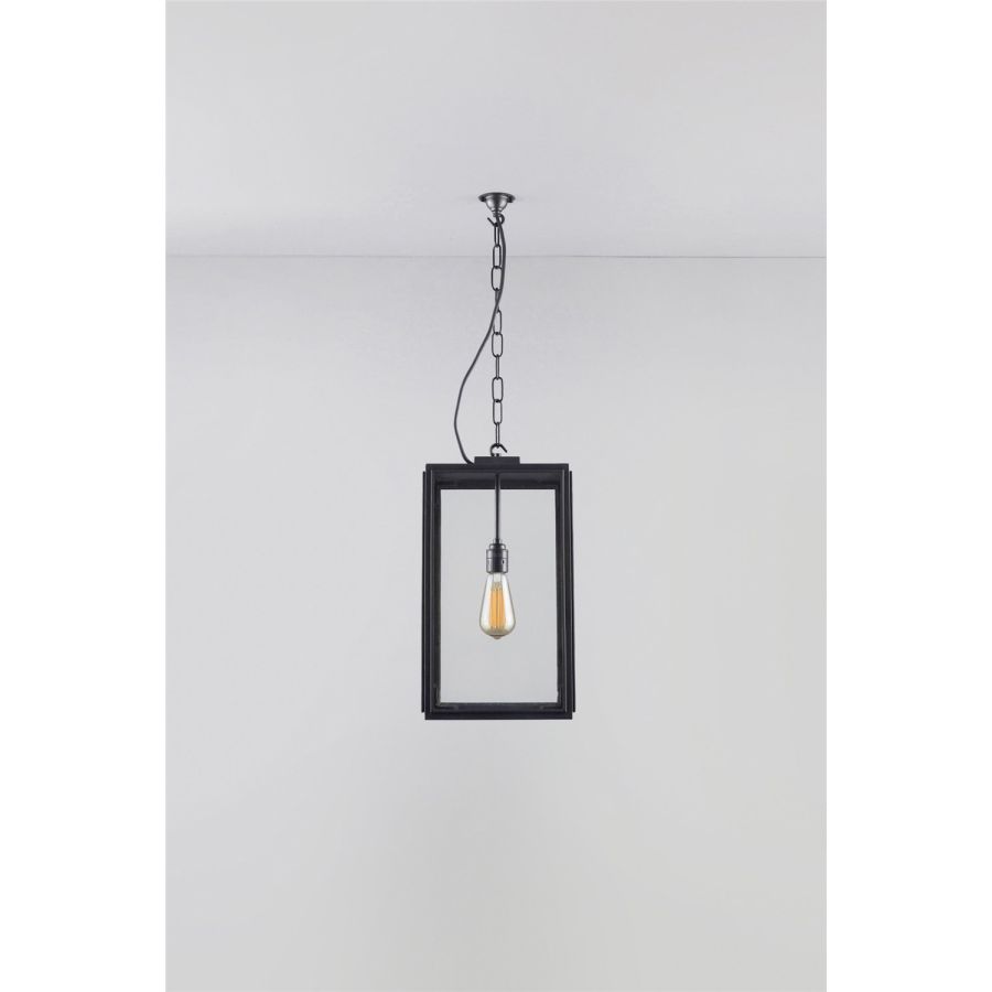 Exterior Square Pendant in weathered brass, externally glazed and available in three sizes. Suspended on a weathered brass hook 1.5 meters of chain. Glass on four sides, with a closed top for exterior use.