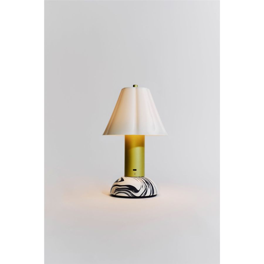 Combining maximalist aesthetics with intriguing contrasts, the Blossom FF Edition brings out a vibrant side of our beloved Blossom portable light. Designed by German designer Fabian Freytag, it showcases a striking monochrome, marble-like hydro-dipped base, highlighted by an iridescent green stem and our signature fluted bone-china shade. It's topped off with a metal disc in matching green spelling out Original BTC x Fabian Freytag – a special detail of Blossom FF.