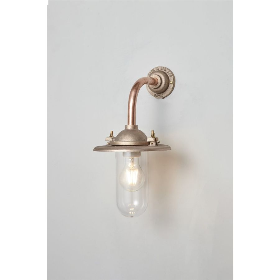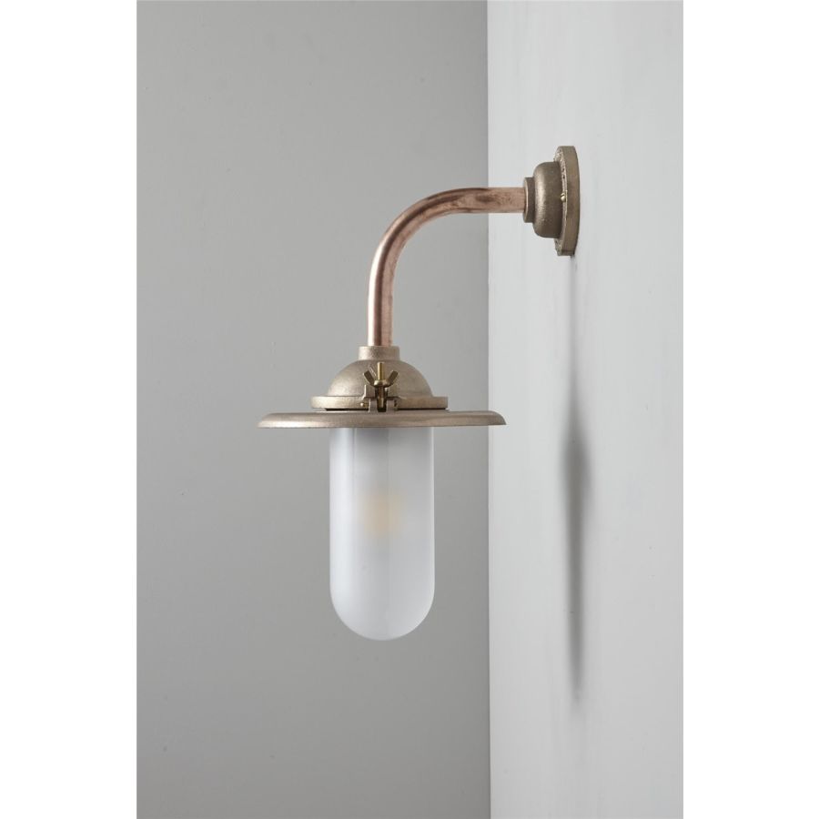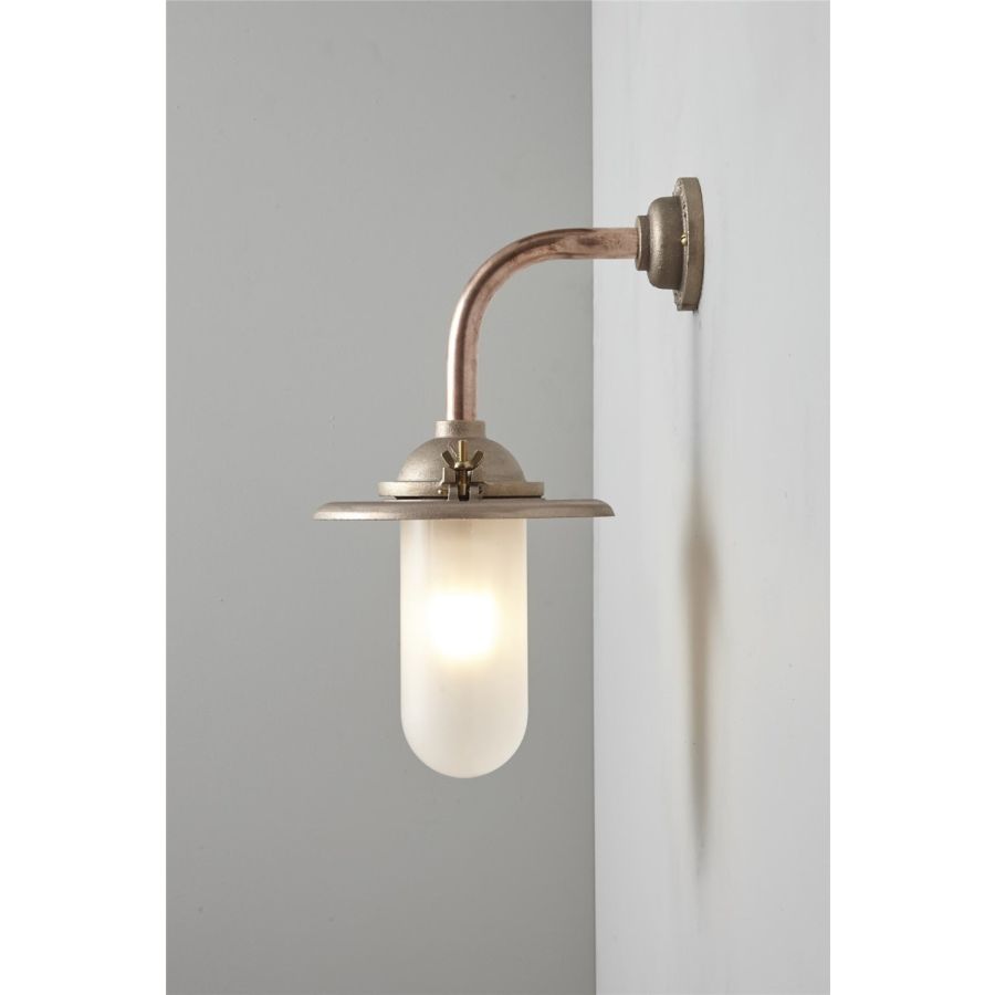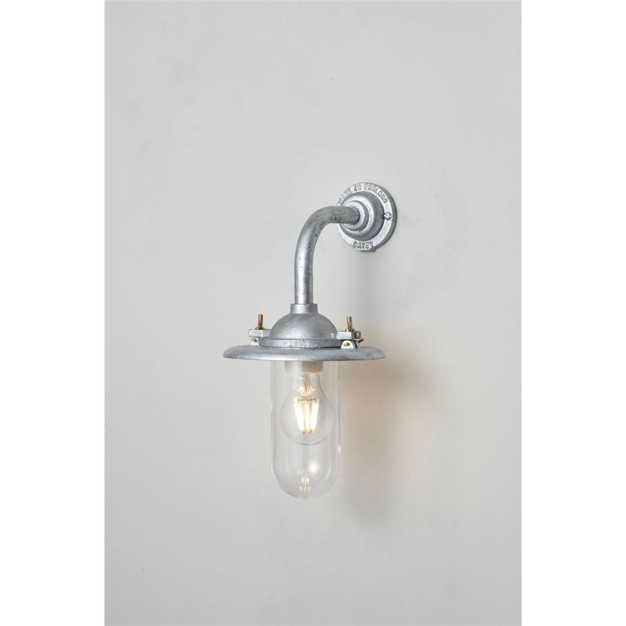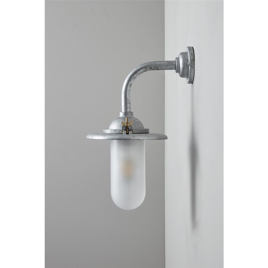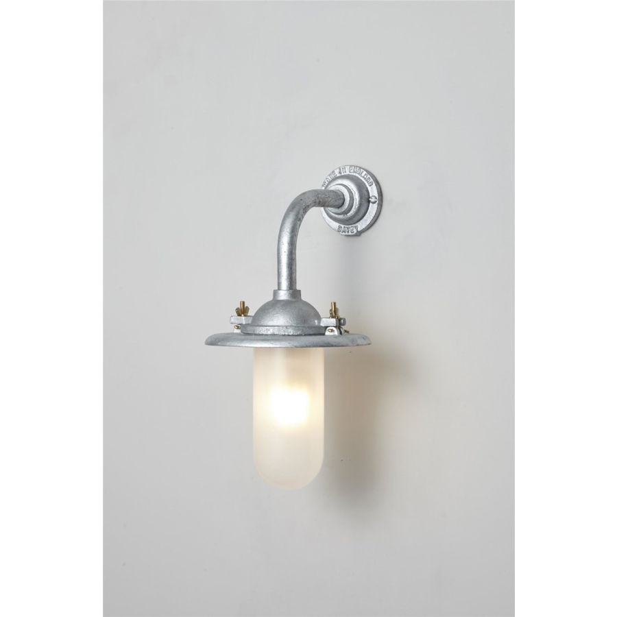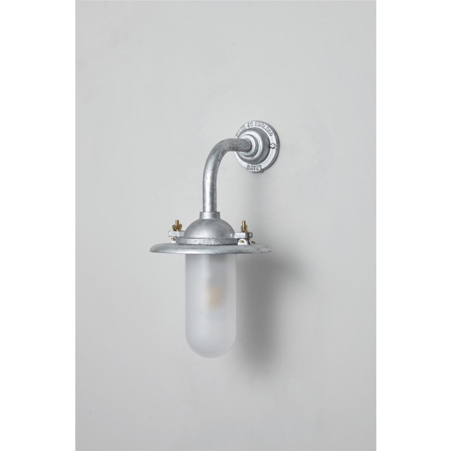 An Exterior Bracket Light with a heavy cast reflector that's held by brass wing nuts and bolts for easier access to the lamp. This industrial wall light is available in either galvanised cast iron or sandblasted bronze, with a canted or right angle arm. Glass is clear or frosted.