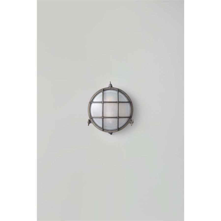 A die-cast bulkhead light in natural brass (unlacquered) with frosted glass diffusers. Also available in weathered brass and a chrome plated finish. Front guard secured by three wing nuts. Glanded surface cable entry.