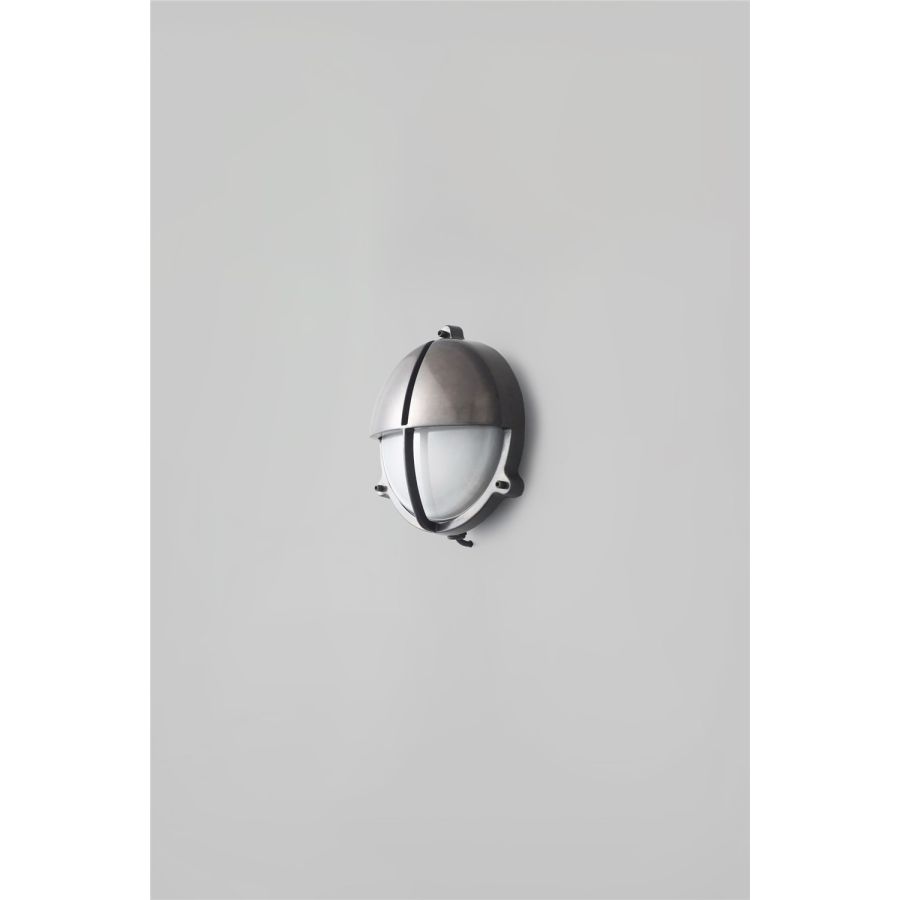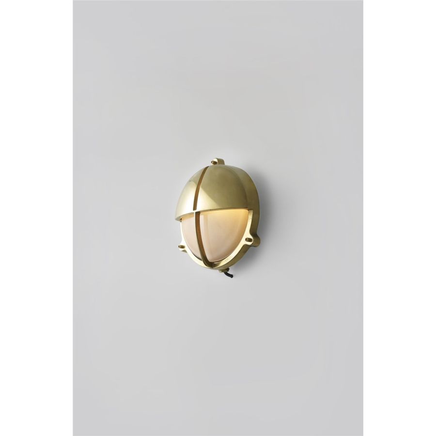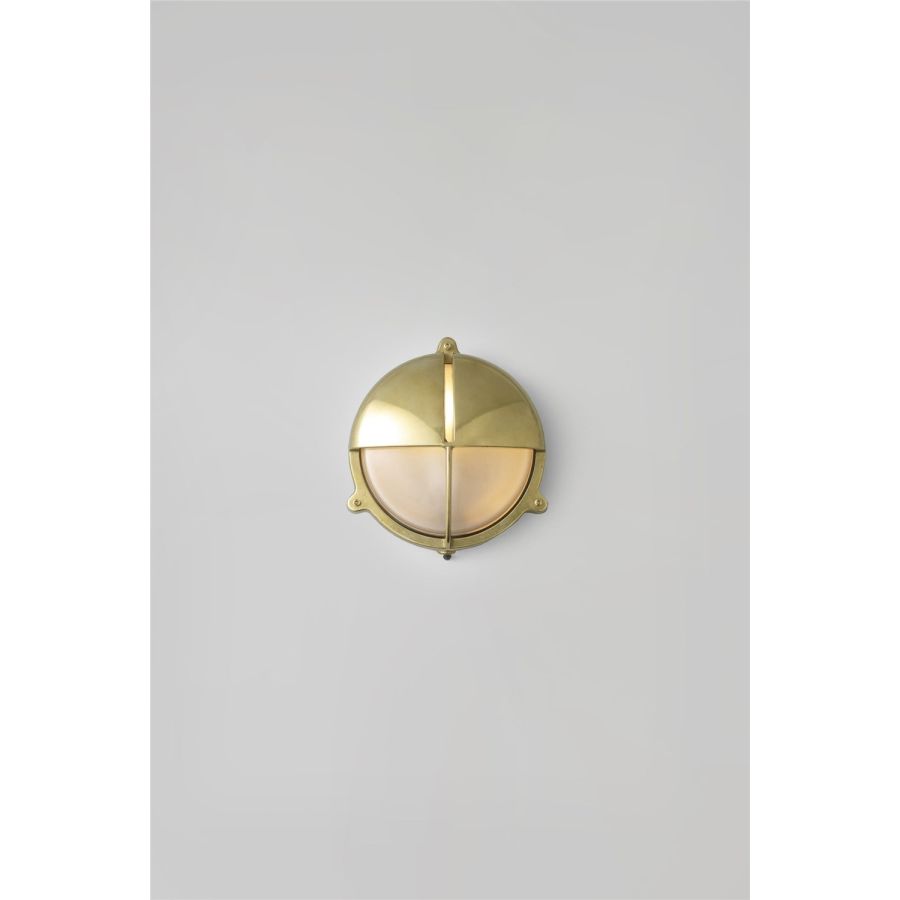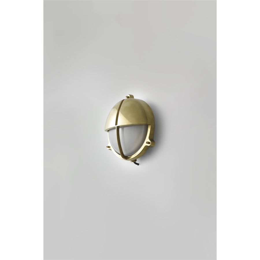 Die-cast bulkhead light in natural brass, unlacquered with frosted diffusers and eyelid shield, secured with socket head screws. Also available in weathered brass and chrome plated finishes and two different sizes. Glanded surface cable entry.