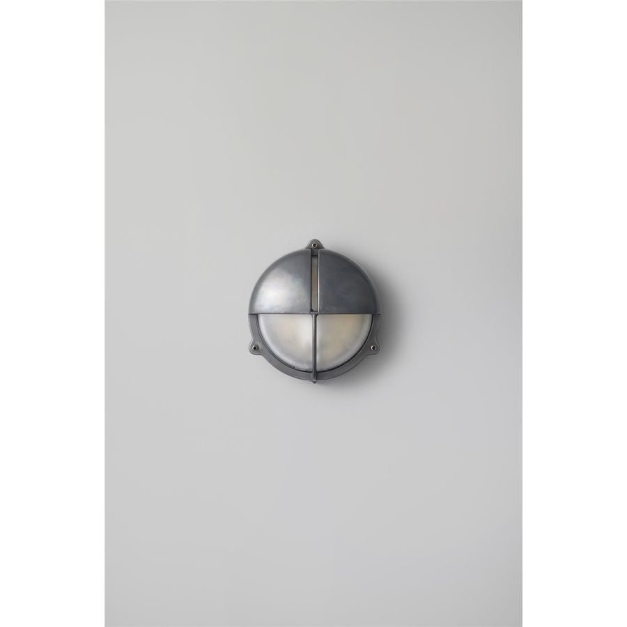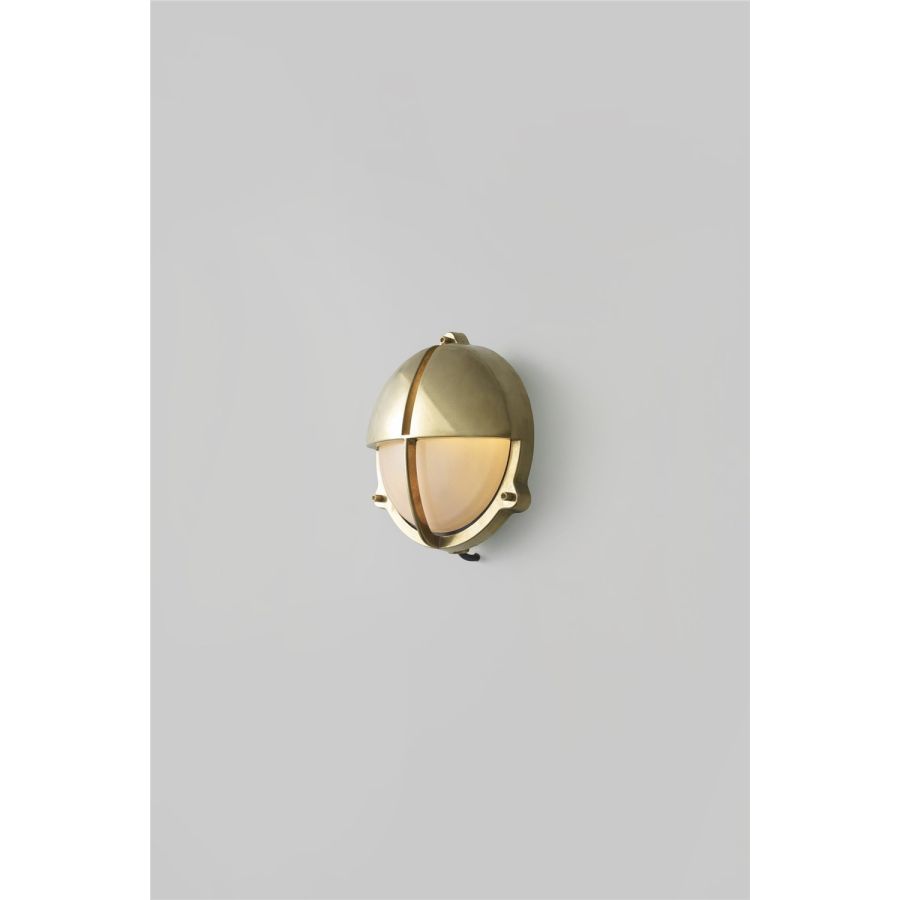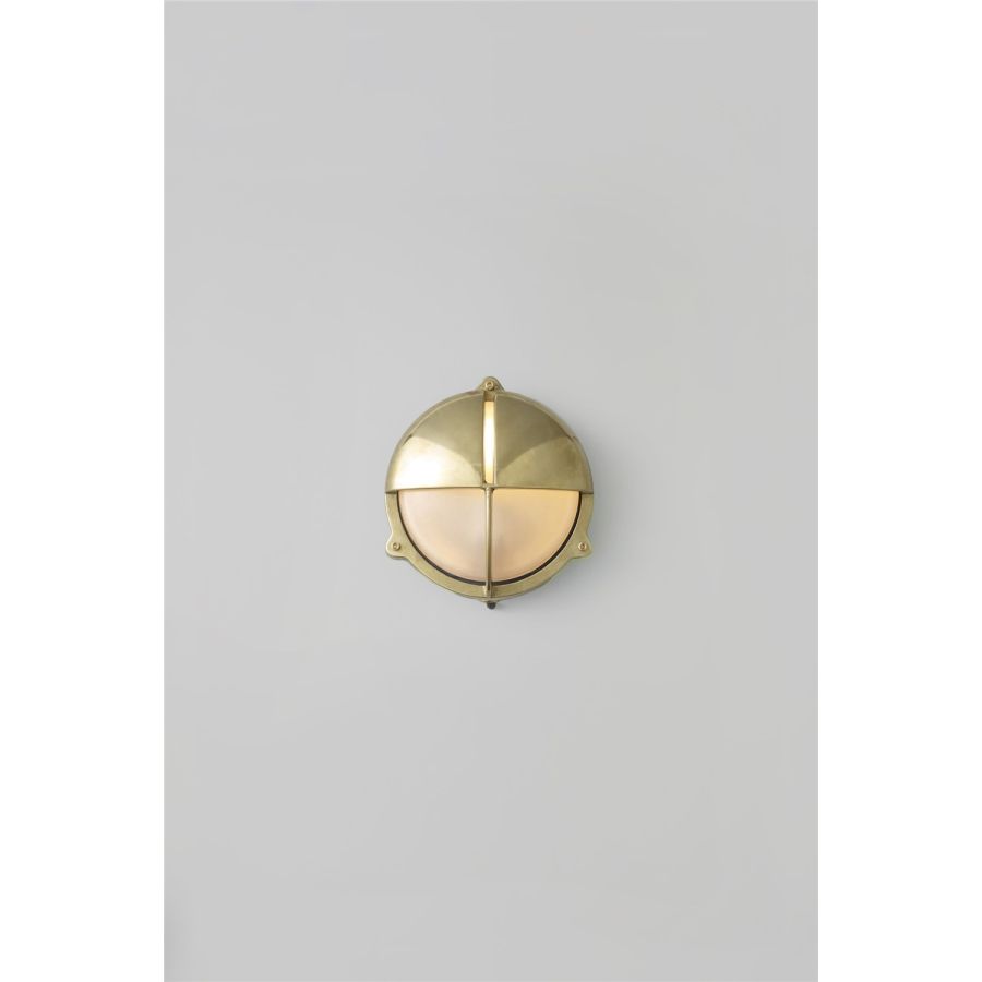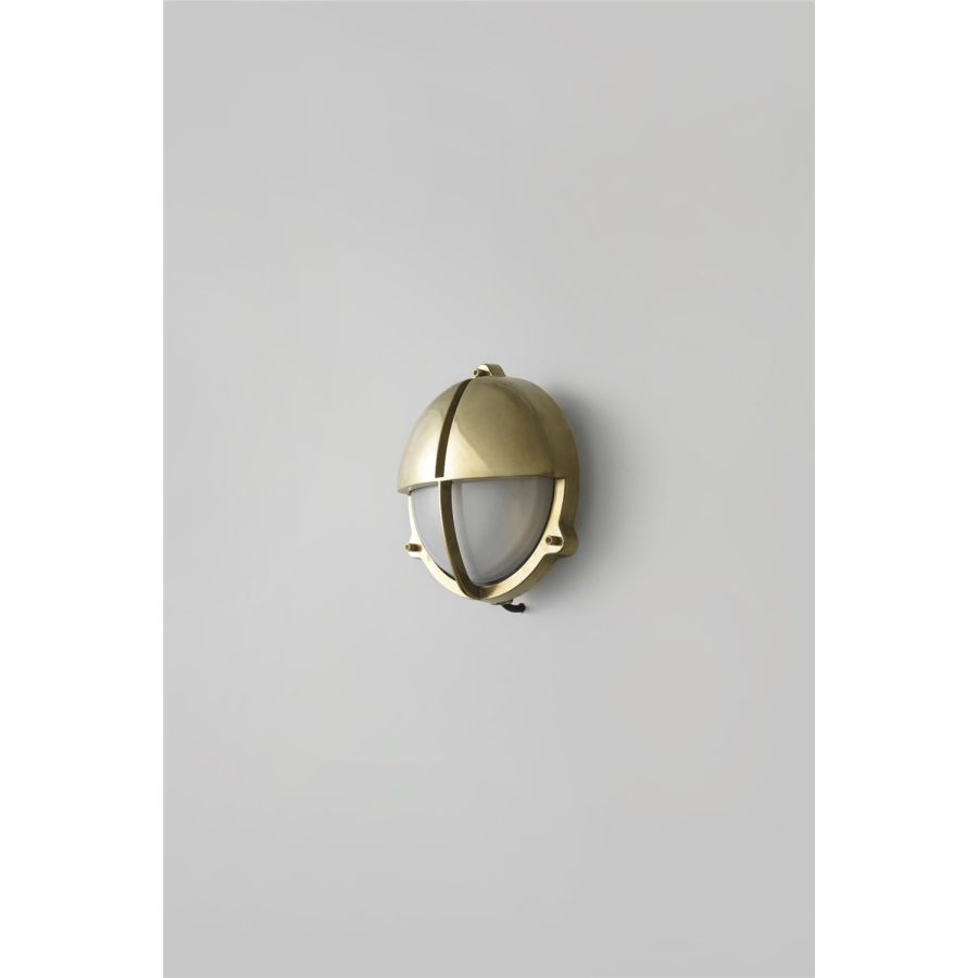 Die-cast bulkhead light in natural brass, unlacquered with frosted diffusers and eyelid shield, secured with socket head screws. Also available in weathered brass and chrome plated finishes and two different sizes. Glanded surface cable entry.