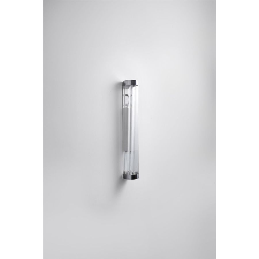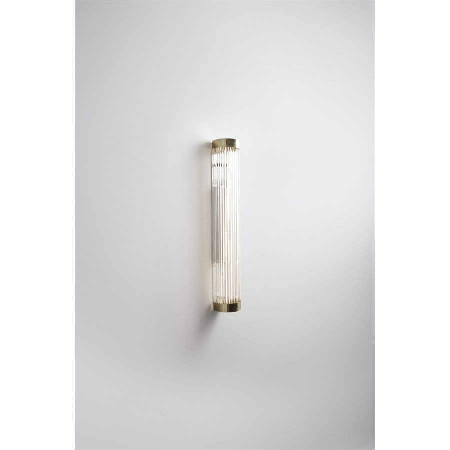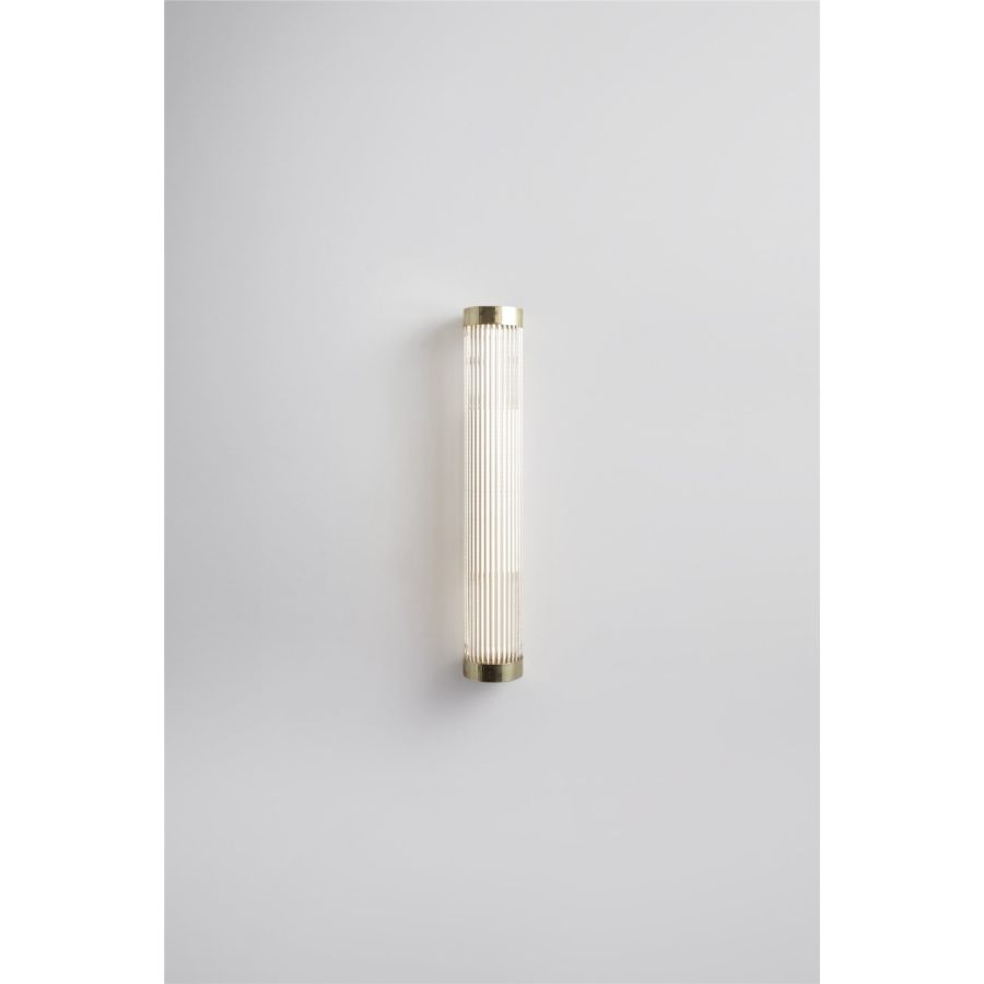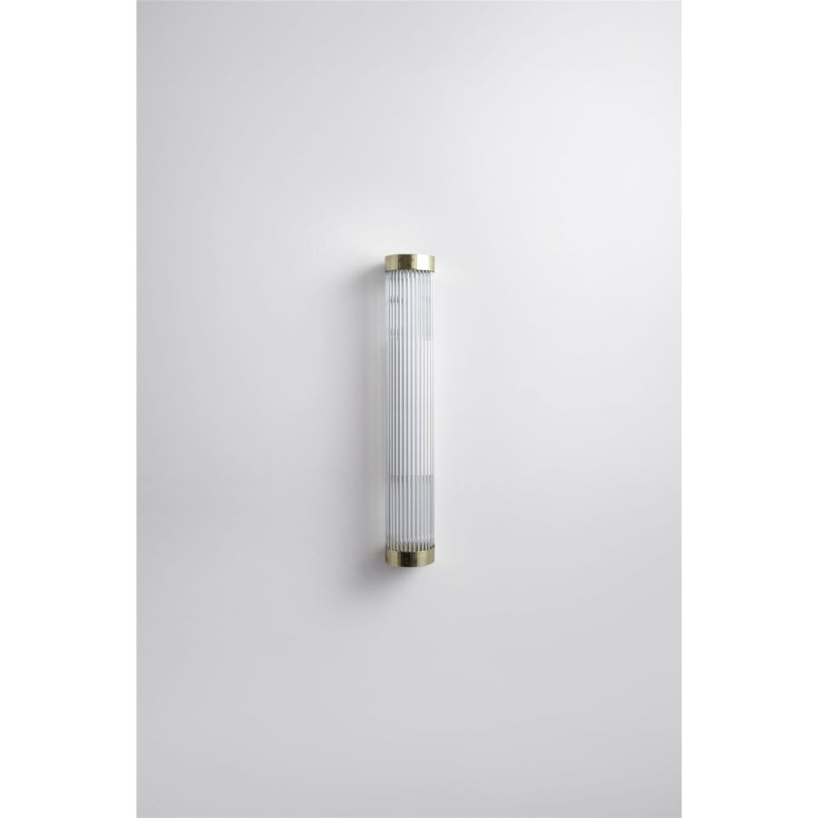 This is the LED version of the 7211 Narrow Pillar Wall Light, with an integral dimmable driver. The light's curved Art Deco-inspired profile is made of 8mm diameter solid glass rods. Available in weathered brass, polished brass or chrome plated finishes and in two different sizes (H:40cm x W:10cm or H:60cm x W:10cm).