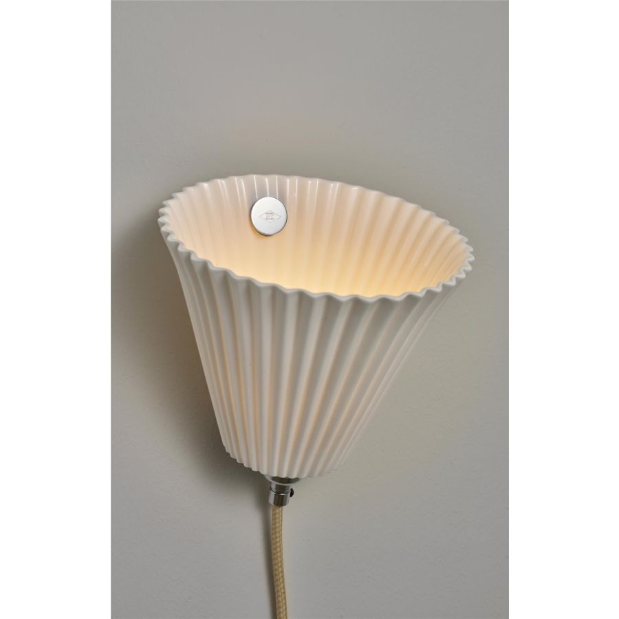 The Portable Pleat is our most flexible wall light. A pleated bone china shade is held to the wall by a satin chromed round wall fixing. Available in two shade sizes, the light has 2.5 metres of cotton braided cable with an inline switch and plug. This allows for the light to be positioned anywhere, without needing hard wiring.