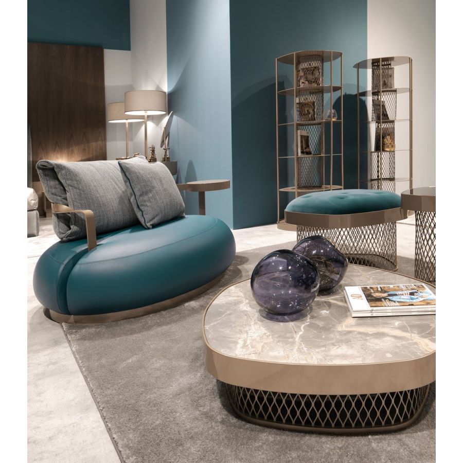 Eine neue Familie von Couchtischen und Bücherregalelementen, die in verschiedenen Größen und Höhen erhältlich sind, um einzigartige und vielfältige Kompositionen zu schaffen. Das perforierte Struktursymbol der Kollektion erinnert an ein Armband, das Tischplatten aus den unterschiedlichsten Materialien trägt: Marmor, Spiegel, Holz und sogar gepolsterte Kissen, um die Stütze in eine Sitzfläche zu verwandeln. Spargel lässt sich perfekt in vielfältigen Kompositionen mit Marmorplatte, Spiegel und gepolstertem Kissen präsentieren.