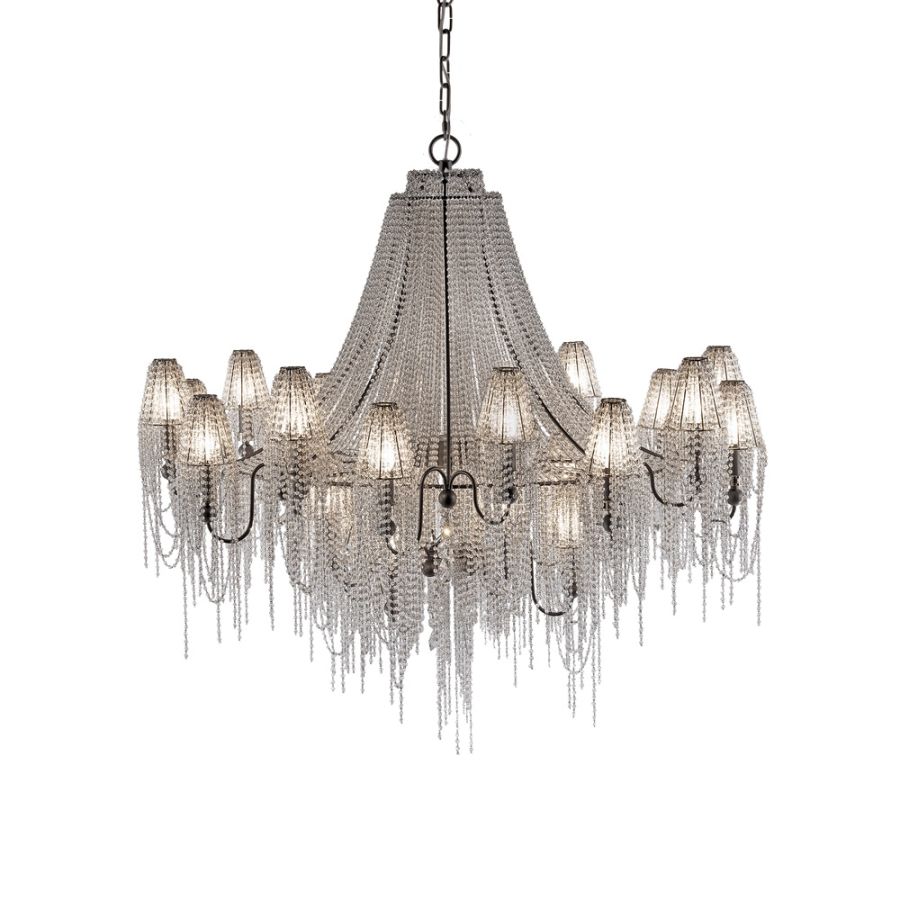 The strings of crystals are exclusively transparent and enriched by irregular elements of different shapes. A coup de theatre of great effect.