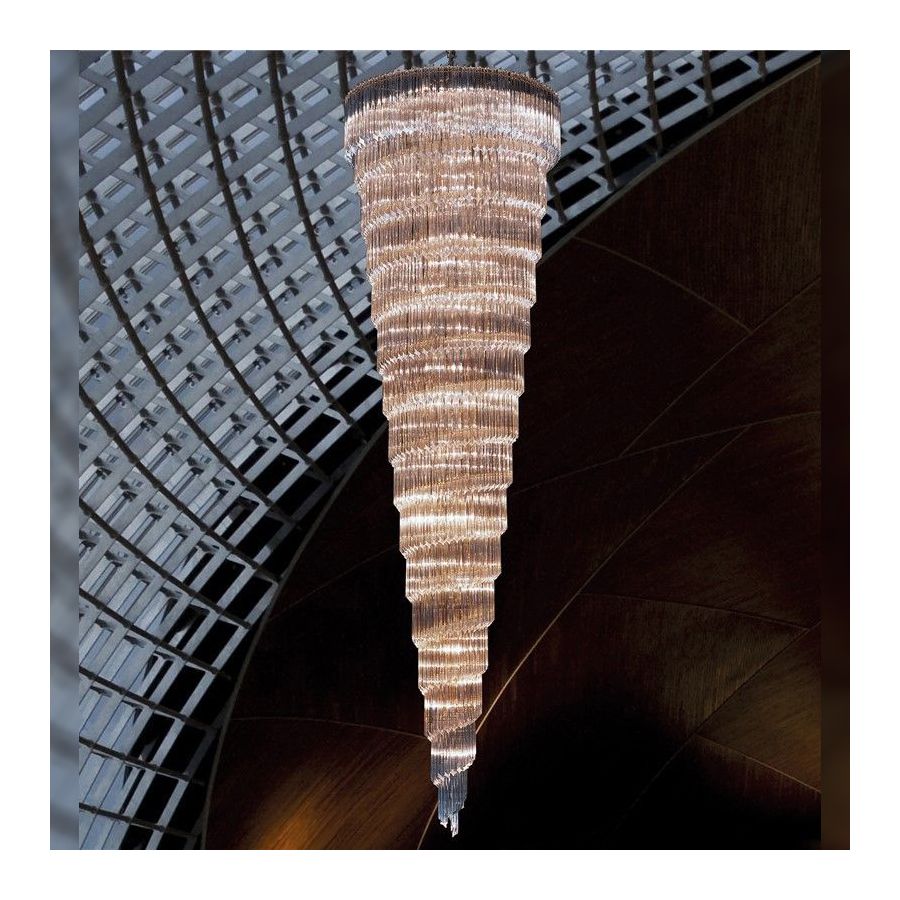 Large chandelier, suitable for wide spaces, in crystal or murano glass, available in different colors. Frame in polished chrome or 24 karat gold