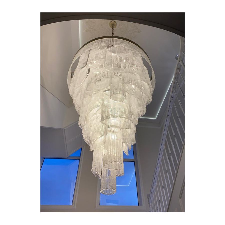 Elegant chandelier for your living room and living area, made of fringes composed of murano glass beads and hand-sewn crystal rods.