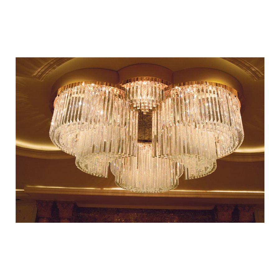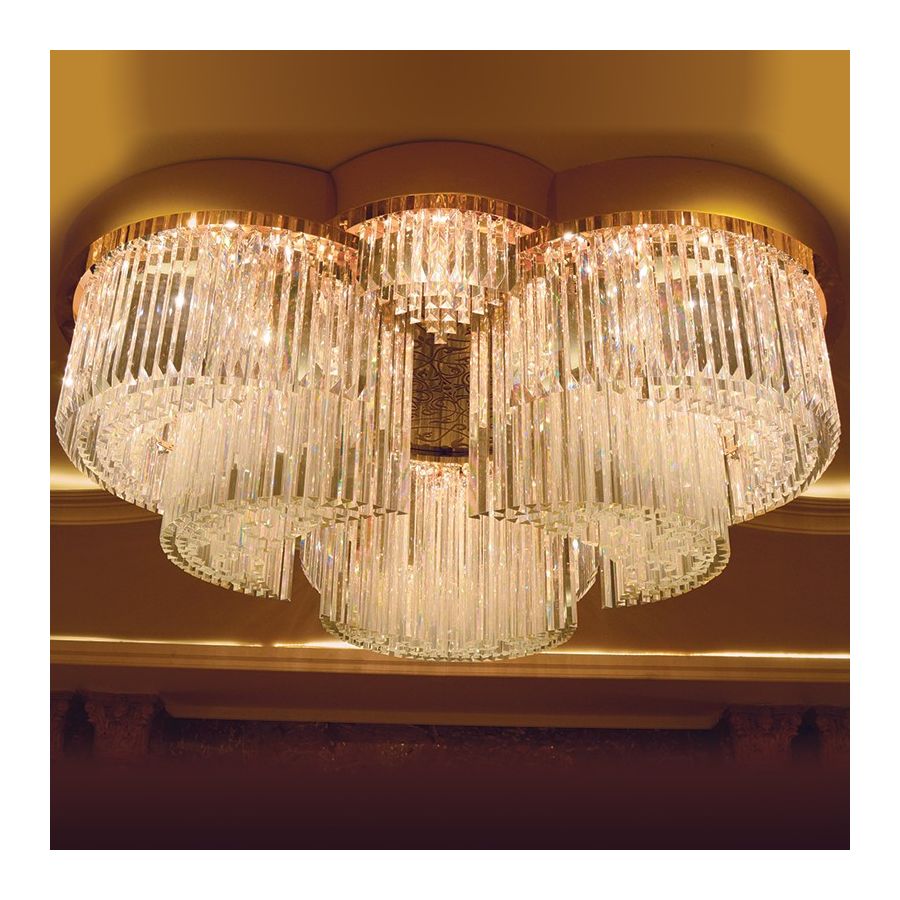 Large ceiling light with pendants in optical crystal with impeccable brilliance; gold or polished chrome finish.