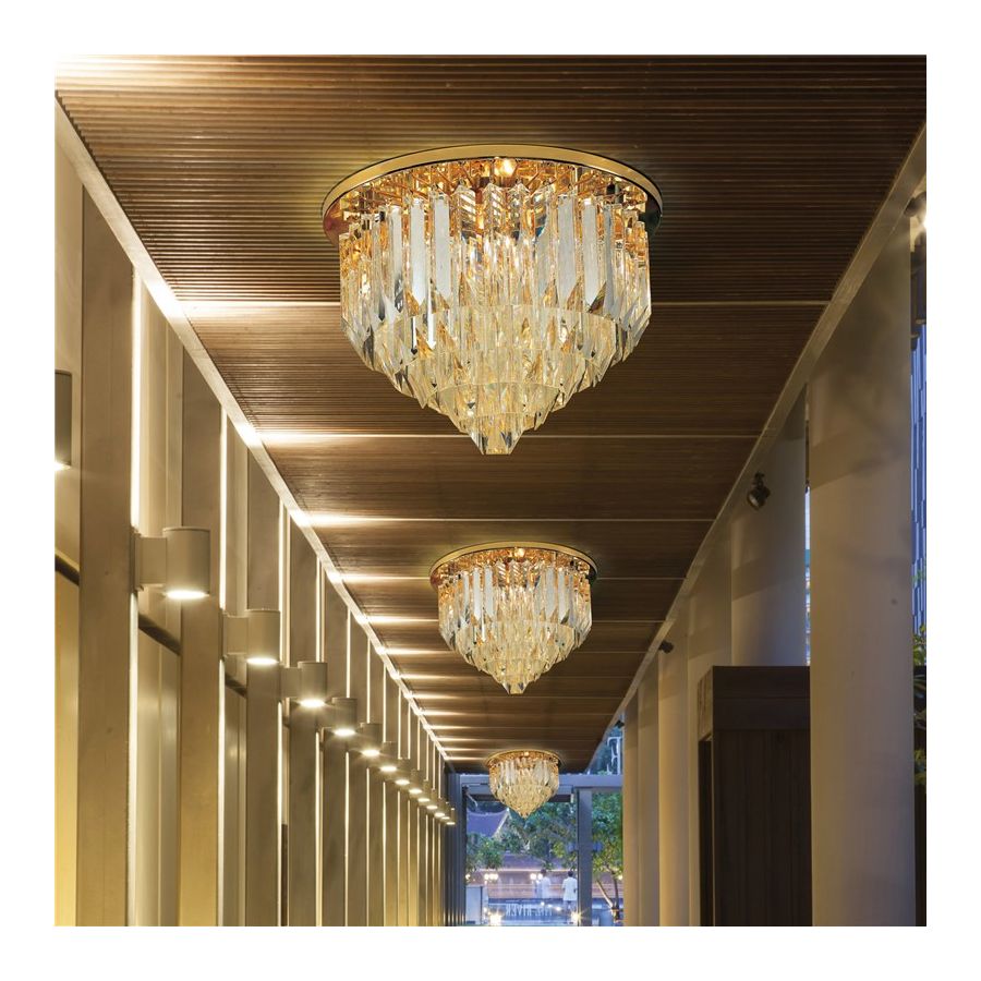 Ceiling lamp with crystal trihedrals in murano glass, frame in 24 karat polished gold.