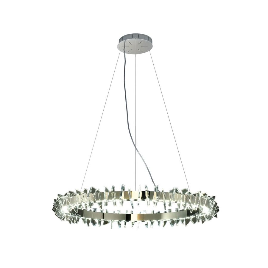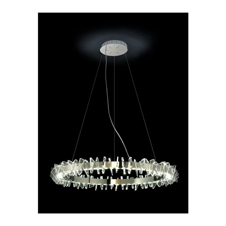 Contemporary pendant chandelier with profile details in clear acrylic. Metal ring structure with gold or polished chrome finish.