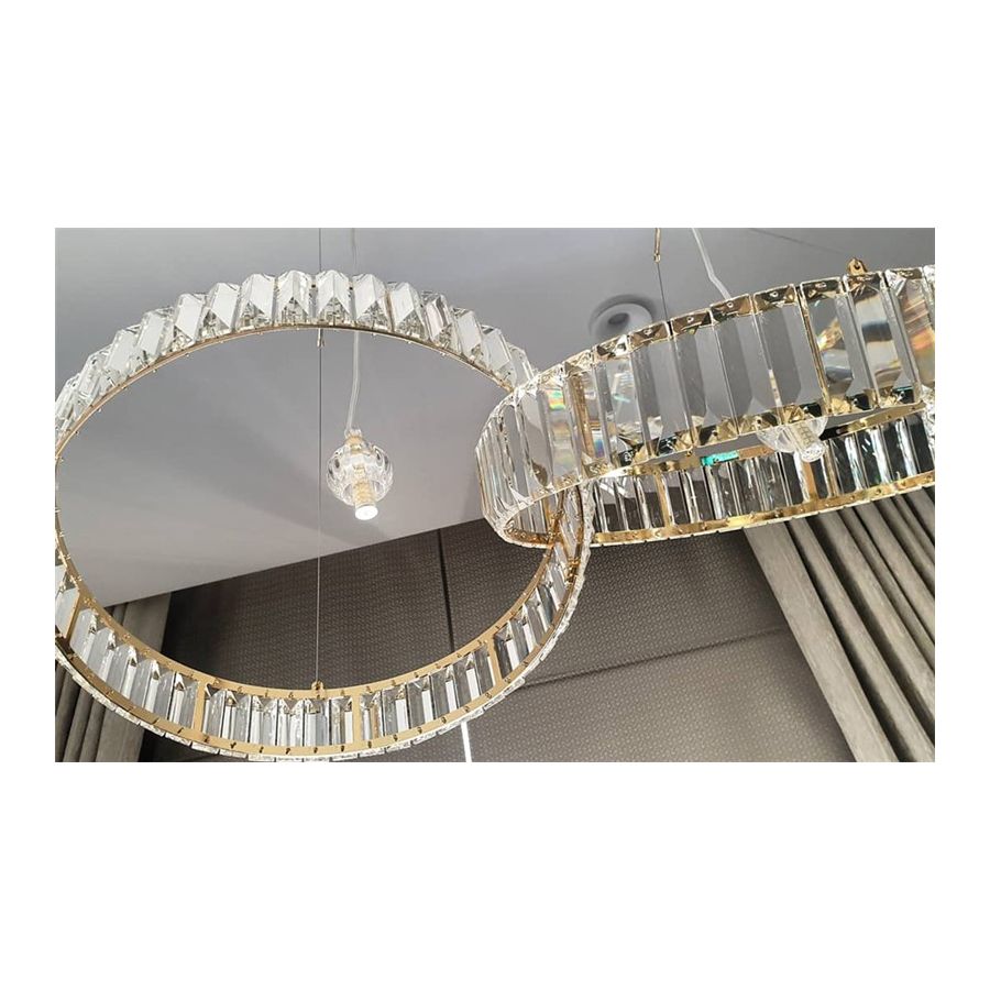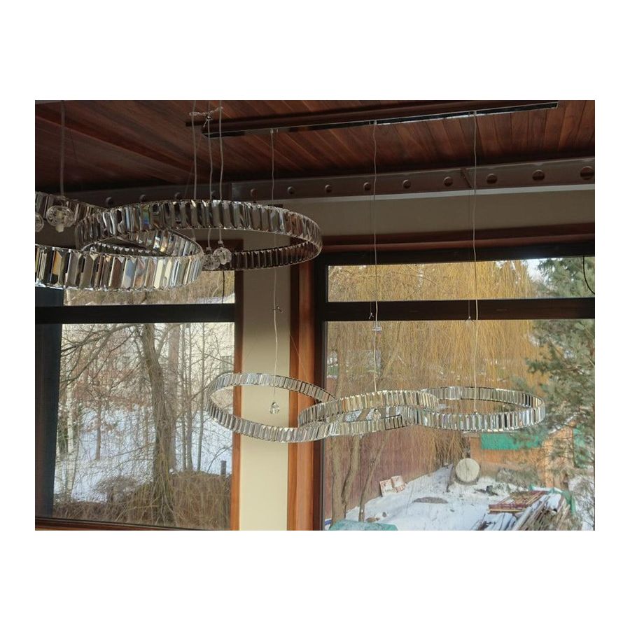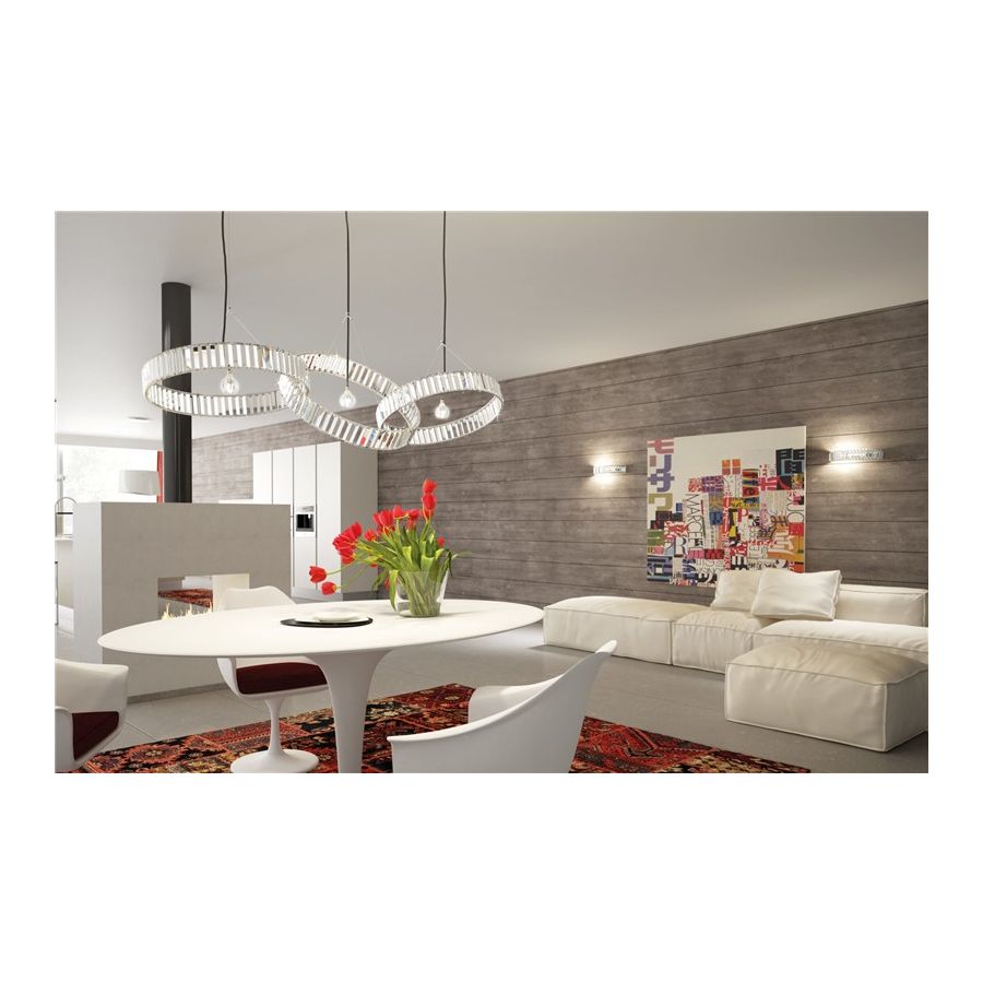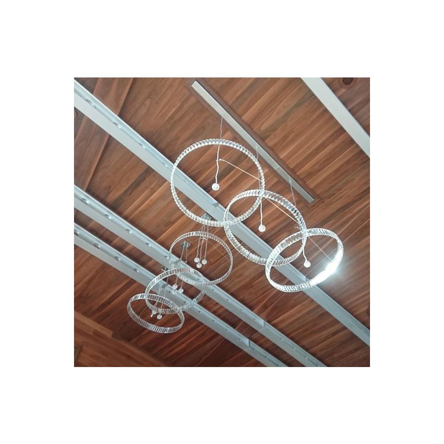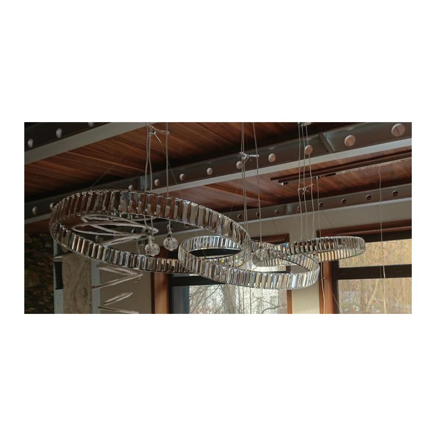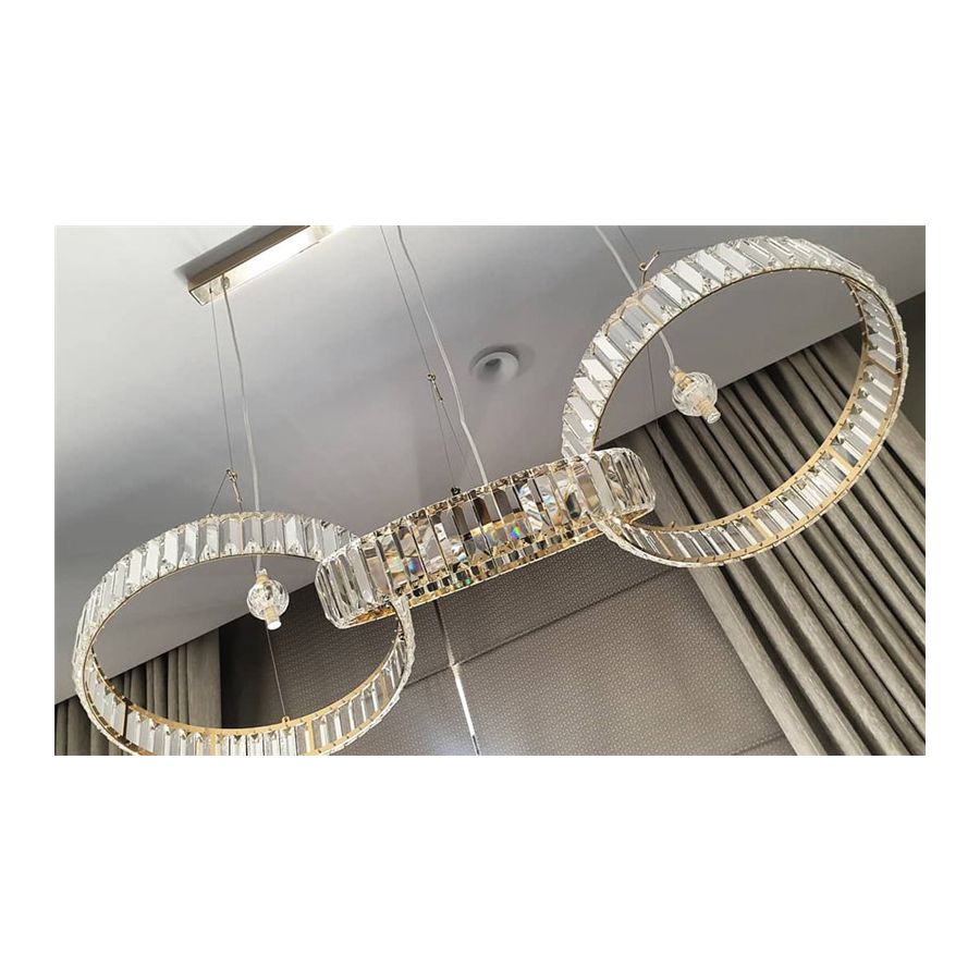 Design pendant with linkable rings made of hand-ground pure crystal. Precious and modern chandelier.