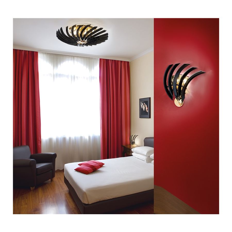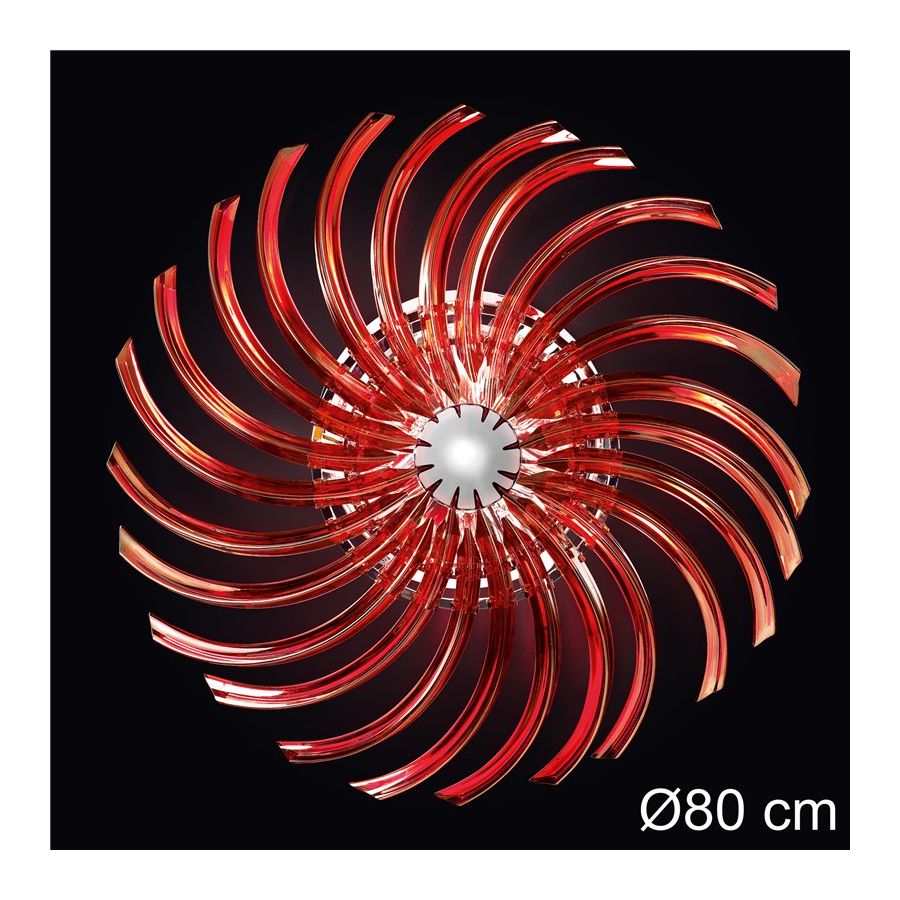 Ceiling light available in different colours in heat-curved murano glass. Polished chrome or 24 karat polished gold metal finish.