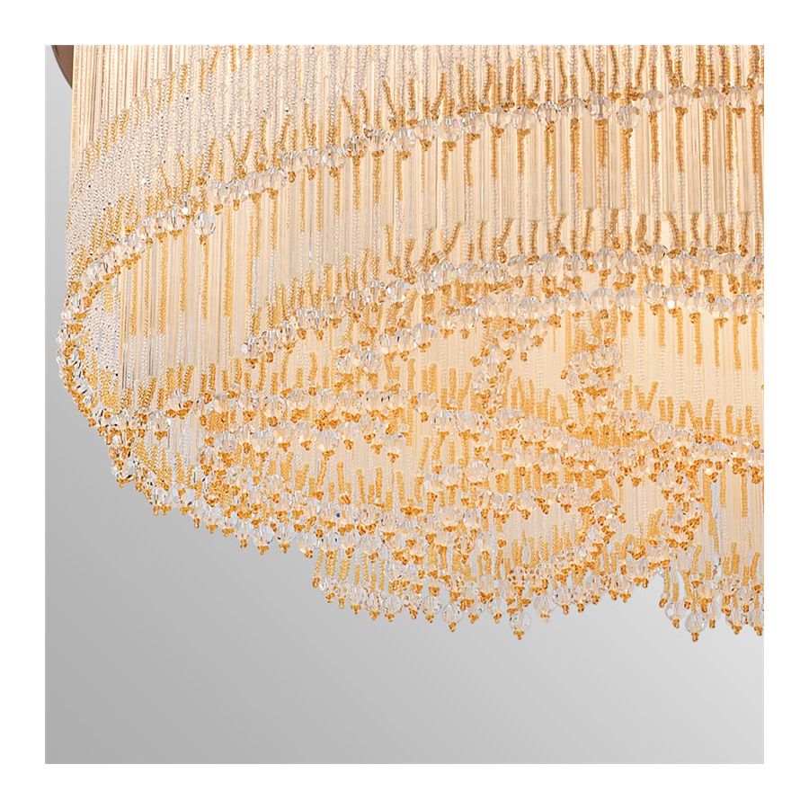 Decorative fringe formed by tiny beads made of murano glass, ultra-pure crystal rods and crystal pearls, all assembled and sewn by hand according to the venetian tradition.