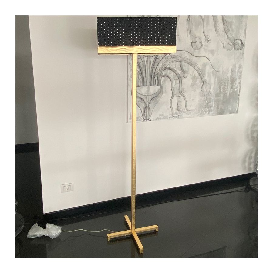 Floor lamp with decorative elements in colourful murano glass, a frame in gold and a shade wiyh pois.