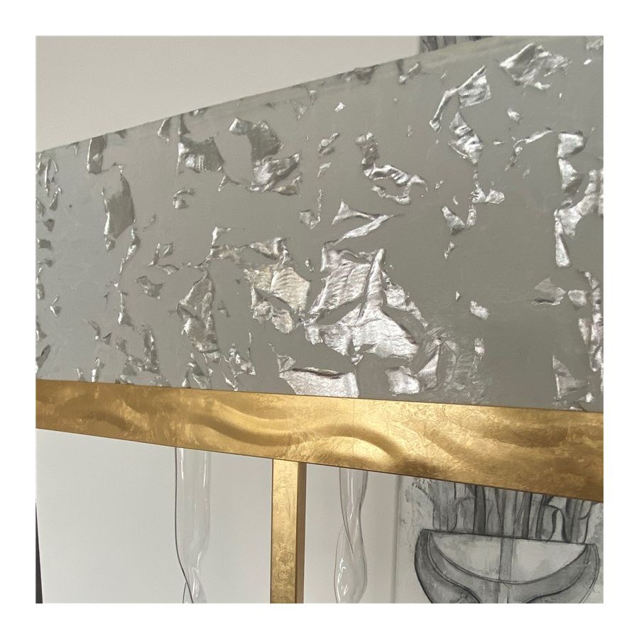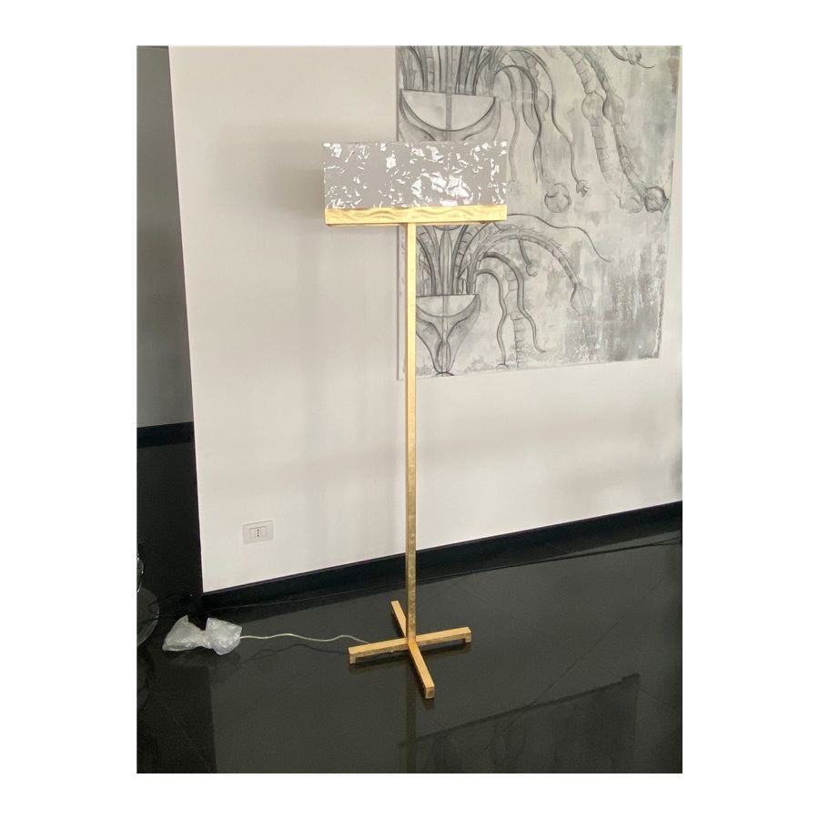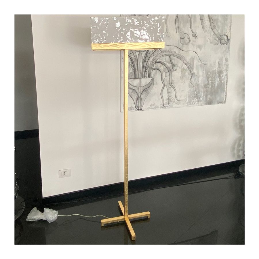 Floor lamp, with a frame in golden leaf and a shade decorated in silver leaf.